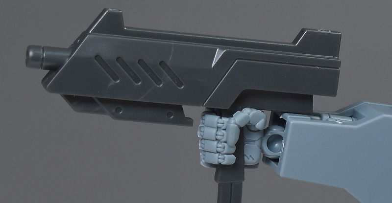 サブマシンガンは一旦手甲をバラし、ハンドパーツでグリップを握らせて保持します。特にダボ固定ではないため、少し上下しますが、グリップとハンドパーツ穴とのサイズが合っているのである程度安定した保持ができます。