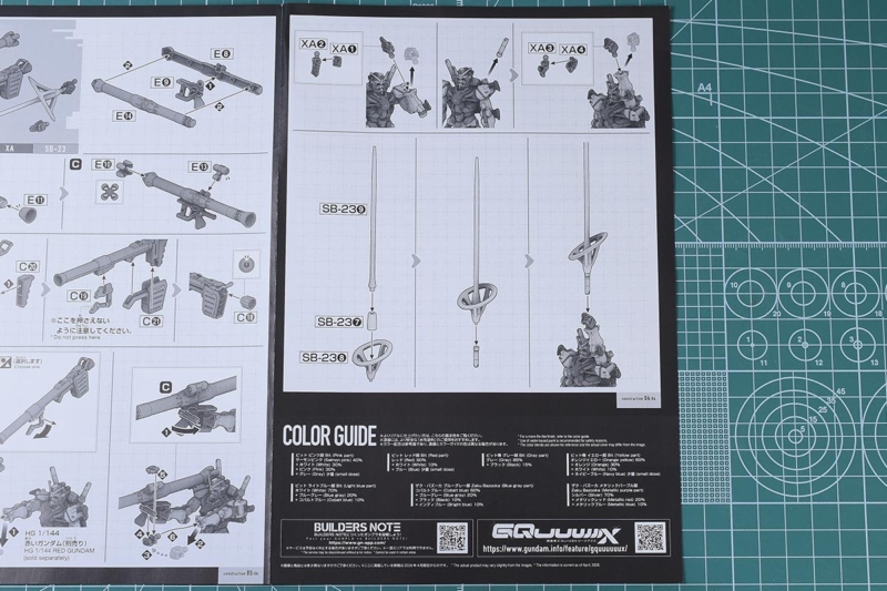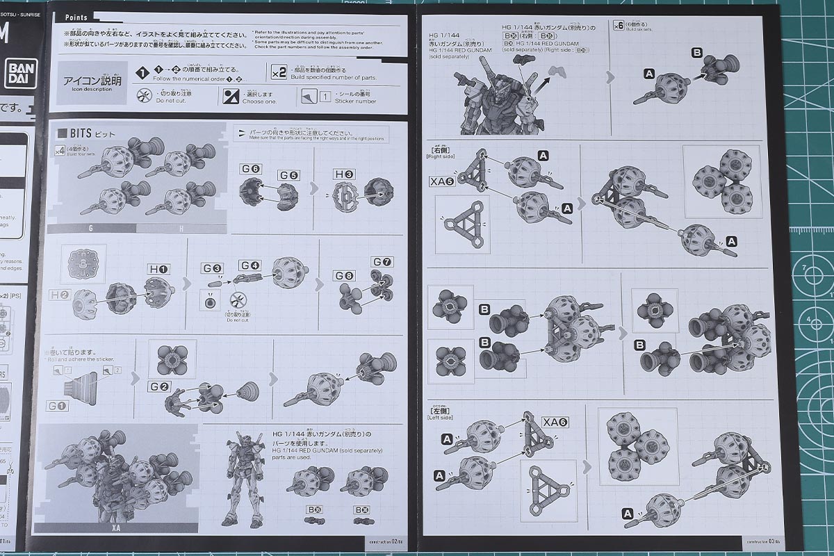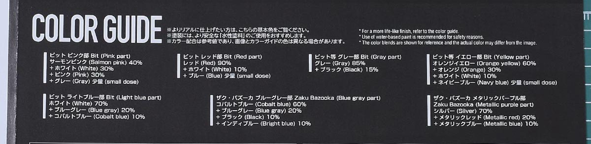 カラーガイド。ビット系の何色かはHG赤いガンダムと同じですが、いくつかの色味はこのキット独自のものになるかと思います。特にビット ライトブルー部というのは赤いガンダムにはなかった色味ですが、公式ページを見てもどの部分の色味なのか確認が取れず;ライトブルー・・・?
