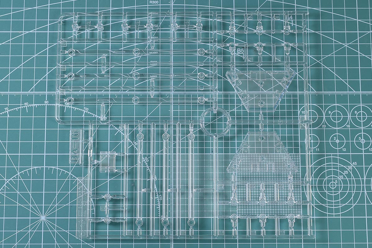↑BA-16ランナー。クリア成形色で、ウェポンディスプレイベースの支柱や底板パーツ。