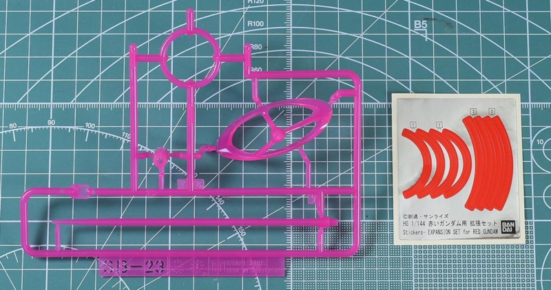 ↑SB-23ランナー。ホイルシール。SB-23はクリアピンク成形色で、ビーム・サーベル用エフェクトパーツ。こちらもこのHG赤いガンダム用拡張セット用の新規ランナーです。
