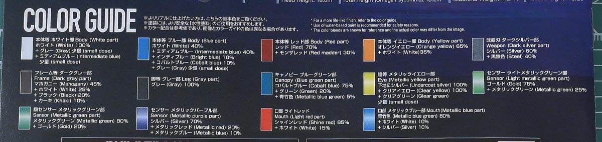 カラーガイド。色種はエグいくらいに多く、調色も各色ともかなり細かいです。成形色にかなりこだわりを感じるので、塗装する場合もこだわってほしいというのがあるんですかね。
