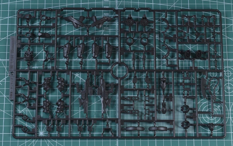 ↑Bランナー。ダークグレー成形色で、非展開状態の頭部や胴体部、腕部、脚部などの各部内部パーツ、フレームパーツ、背部スラスターパーツ、ビーム・ライフルやトメノスケ・ヒート・ホークパーツなど様々。KPS素材です。