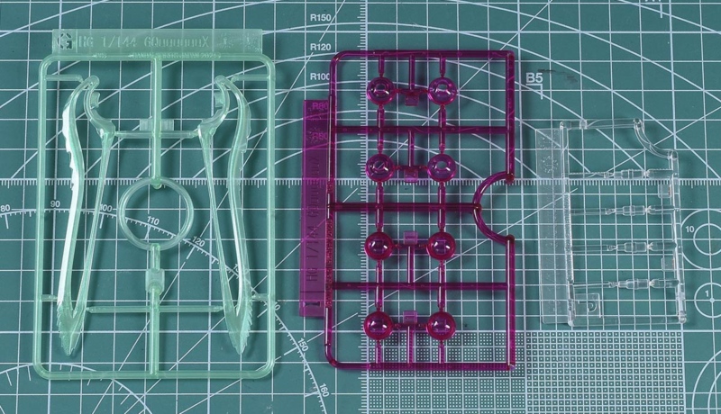G、I、Jランナー。Gは偏光成形のクリアグリーン成形色で、ビームサーベル刃パーツ。Iはクリアパープル成形色で、円形エフェクトの基部パーツです。Jはクリア成形色の円形エフェクト基部パーツ。I、Jランナー共にこのエンディミオン・ユニット覚醒時用の新規ランナーです。