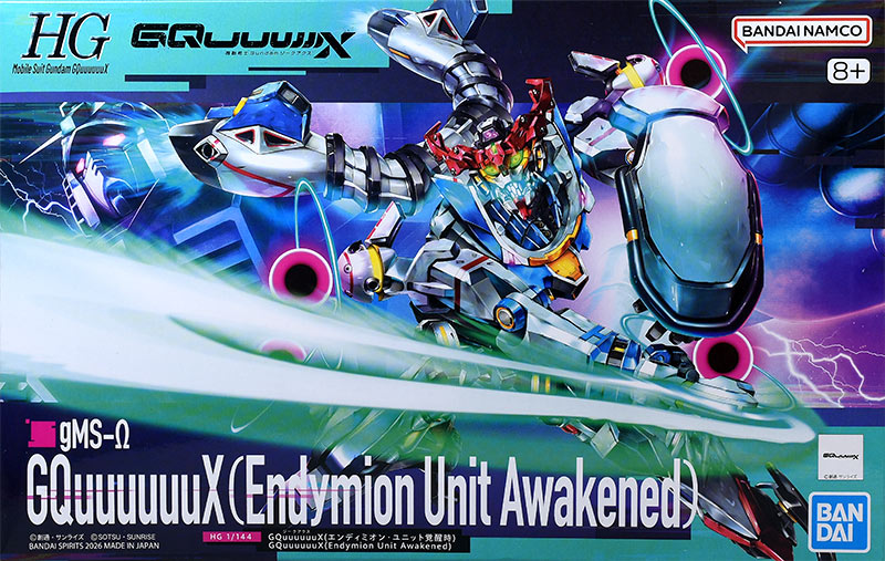HG GQuuuuuuX(エンディミオン・ユニット覚醒時)は、『機動戦士ガンダムGQuuuuuuX』に登場するMS「gMS-Ω GQuuuuuuX(エンディミオン・ユニット覚醒時)」の1/144スケールモデルキットです。覚醒時の頭部のユニット開閉ギミックを搭載。エフェクトパーツが付属し、劇中ラストシーンを飾る印象的なアクションポーズが再現可能となっています。価格は2,860円(税込み)です。