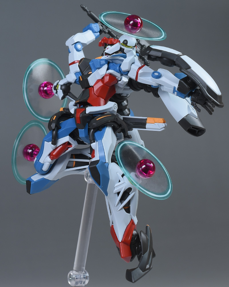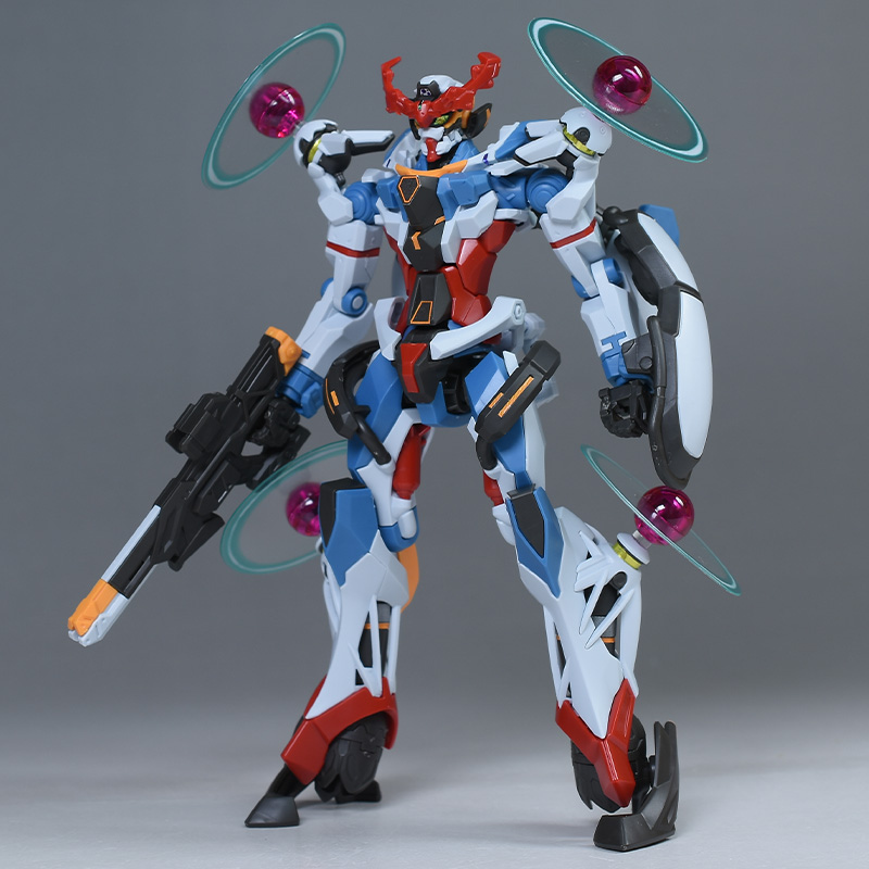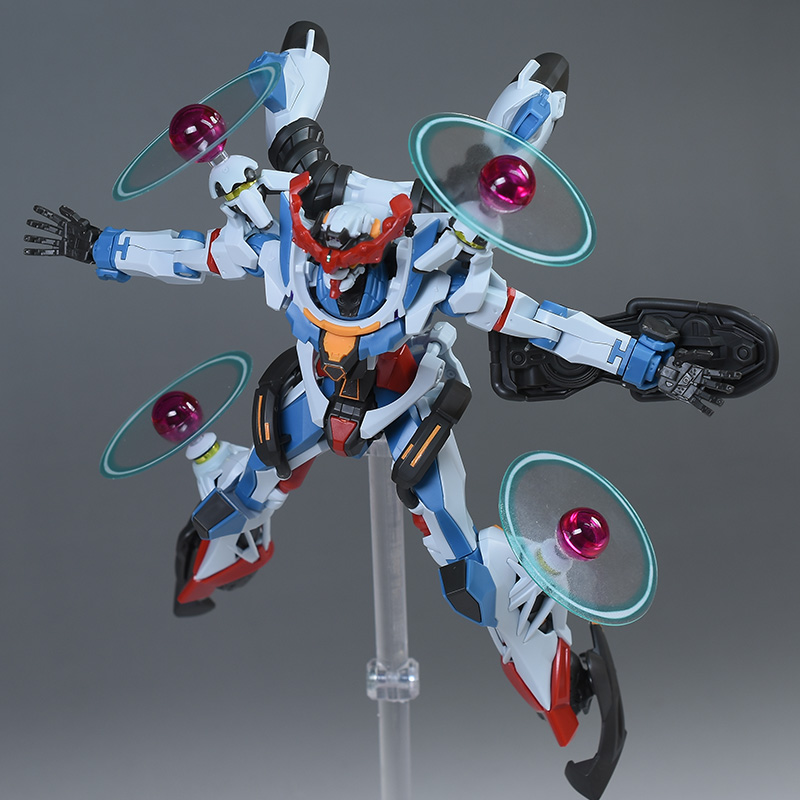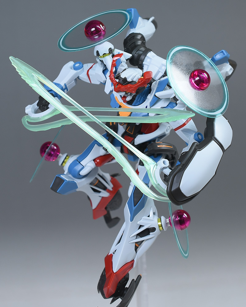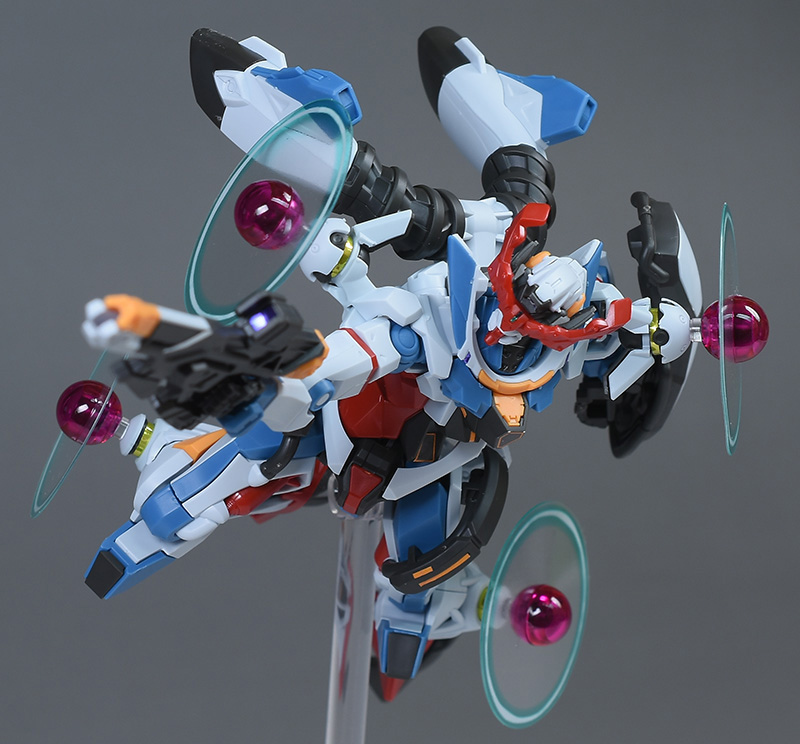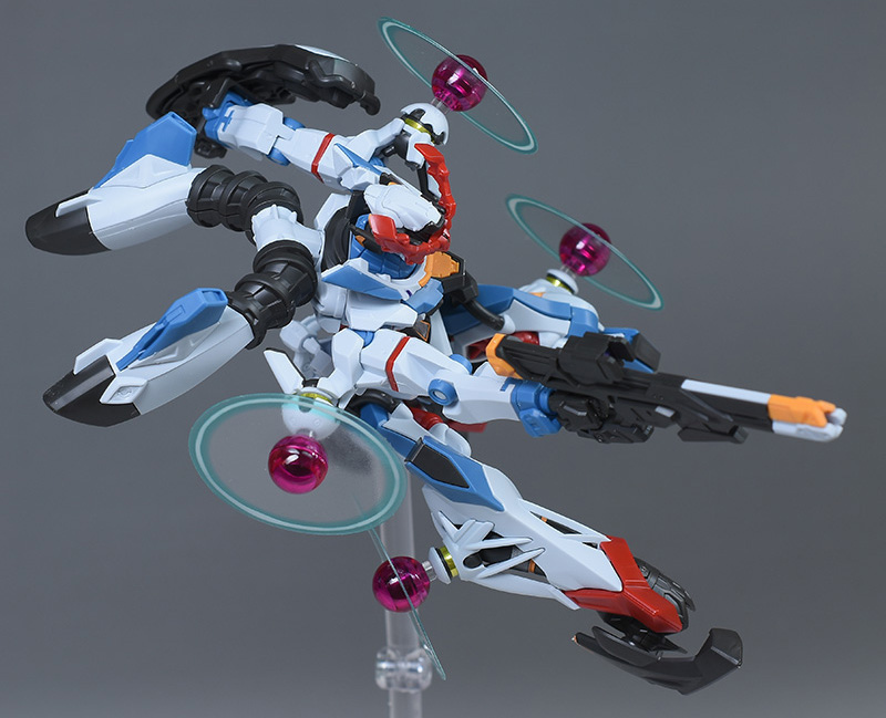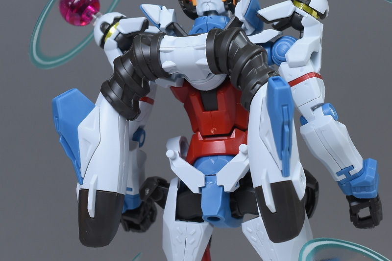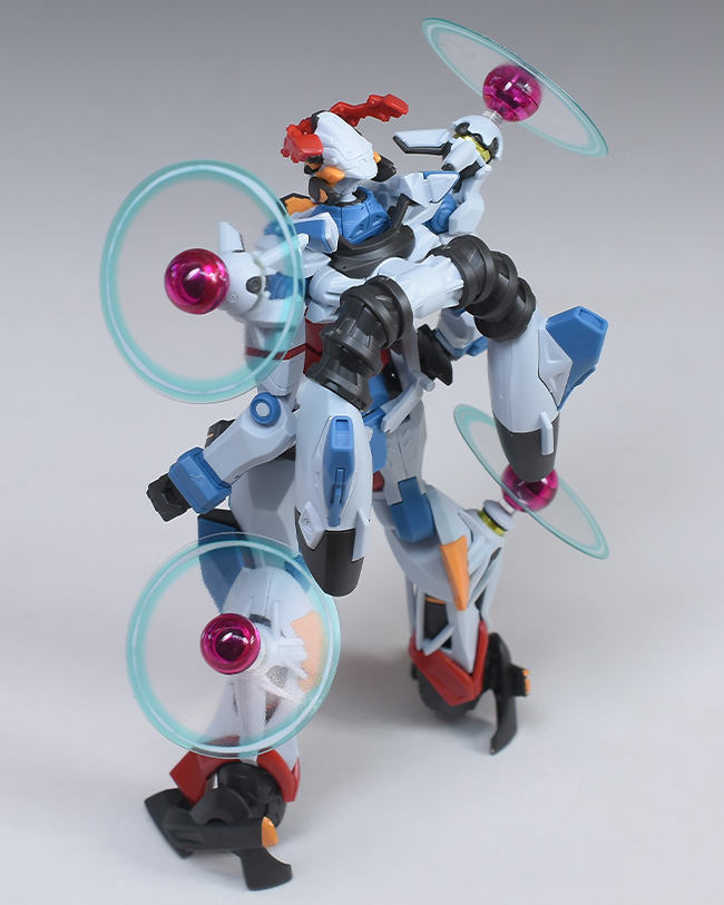 成形色はベースのHG GQuuuuuuXと同じ。少しくすみのあるホワイトを基調に、各部にブルーやレッド、イエローを配色。内部や関節、ビームライフルなどはダークグレー成形色での再現となっています。円形エフェクトの基部はクリアピンク成形色での再現。
