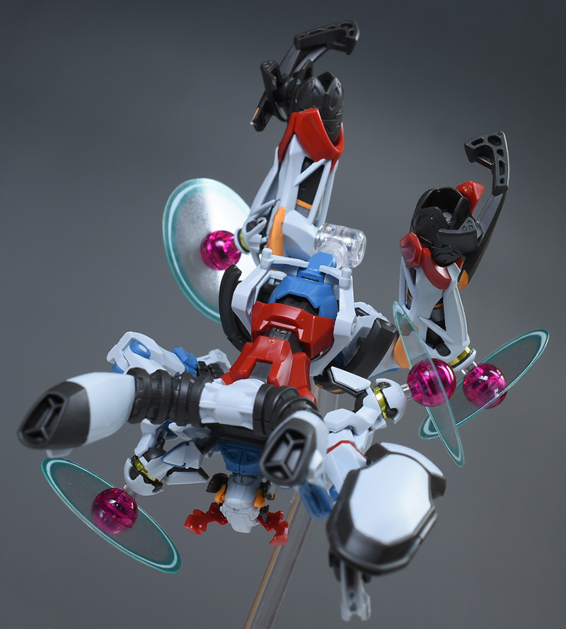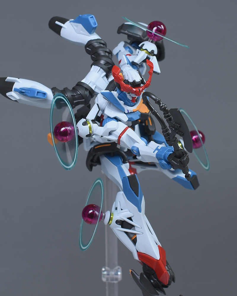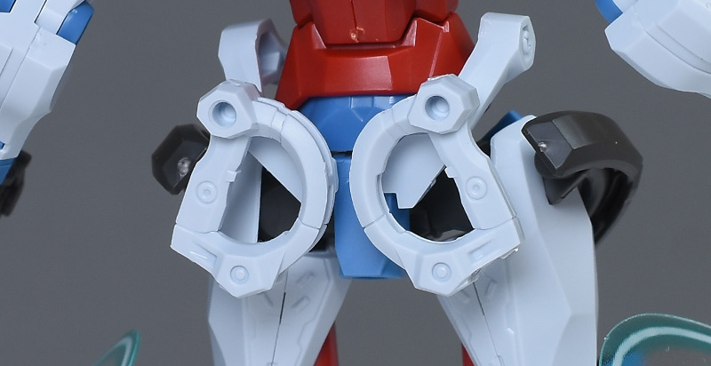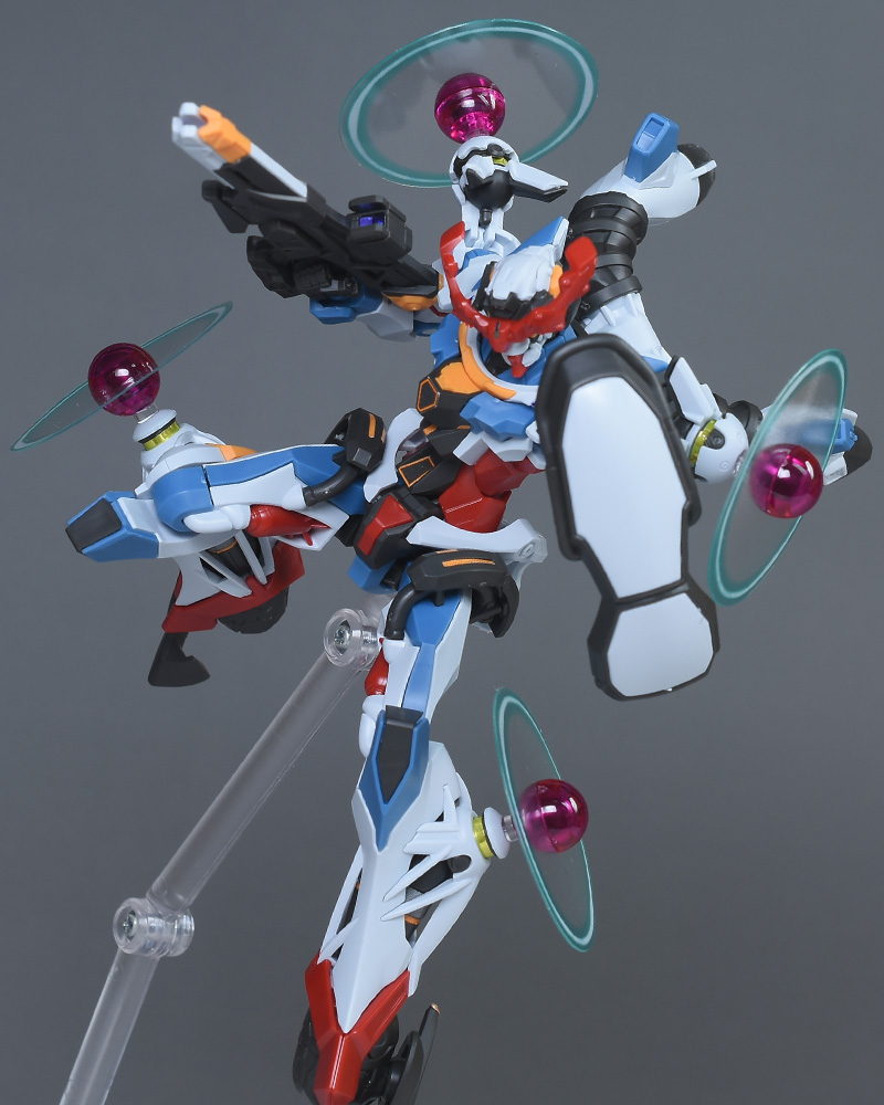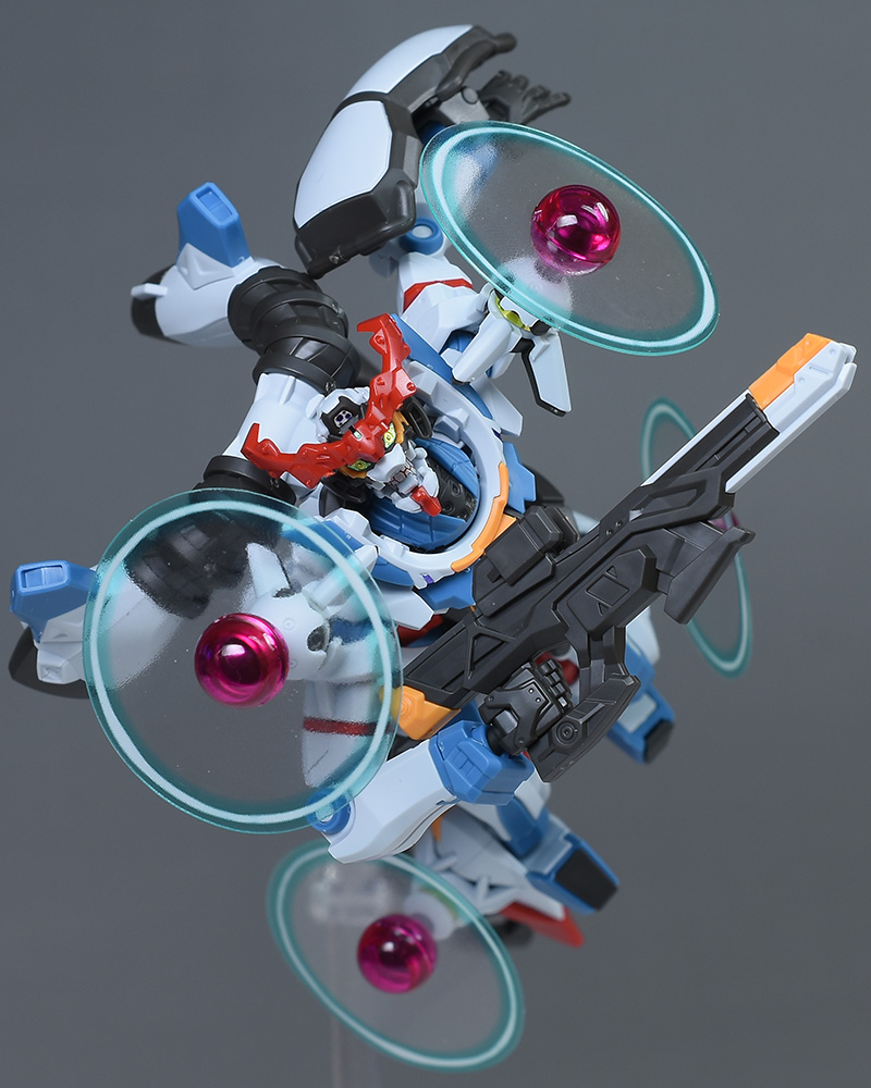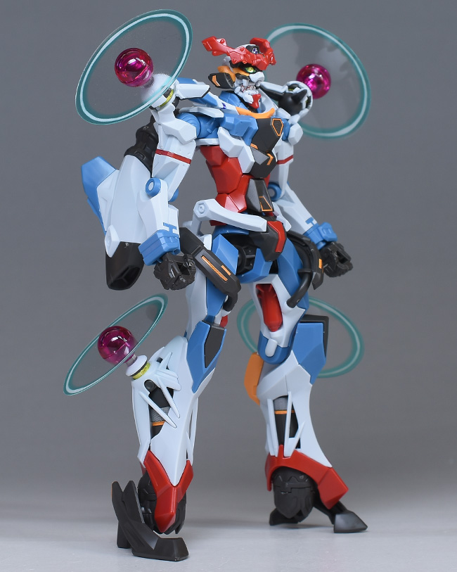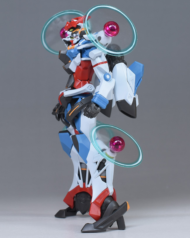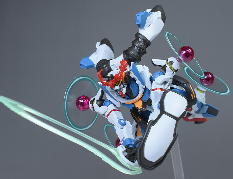 成形色はベースのHG GQuuuuuuXと同じ。少しくすみのあるホワイトを基調に、各部にブルーやレッド、イエローを配色。内部や関節、ビームライフルなどはダークグレー成形色での再現となっています。円形エフェクトの基部はクリアピンク成形色での再現。