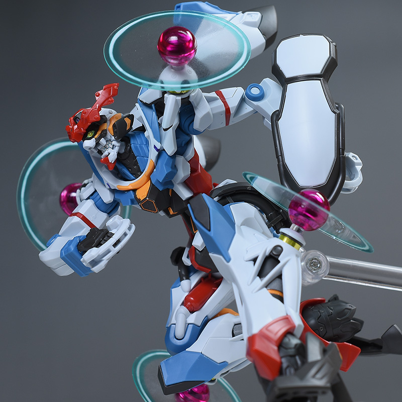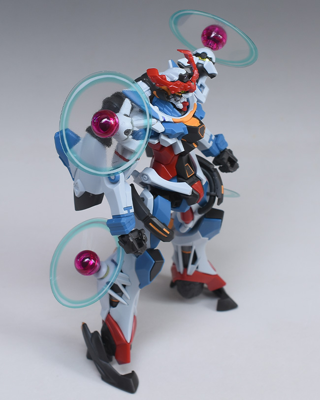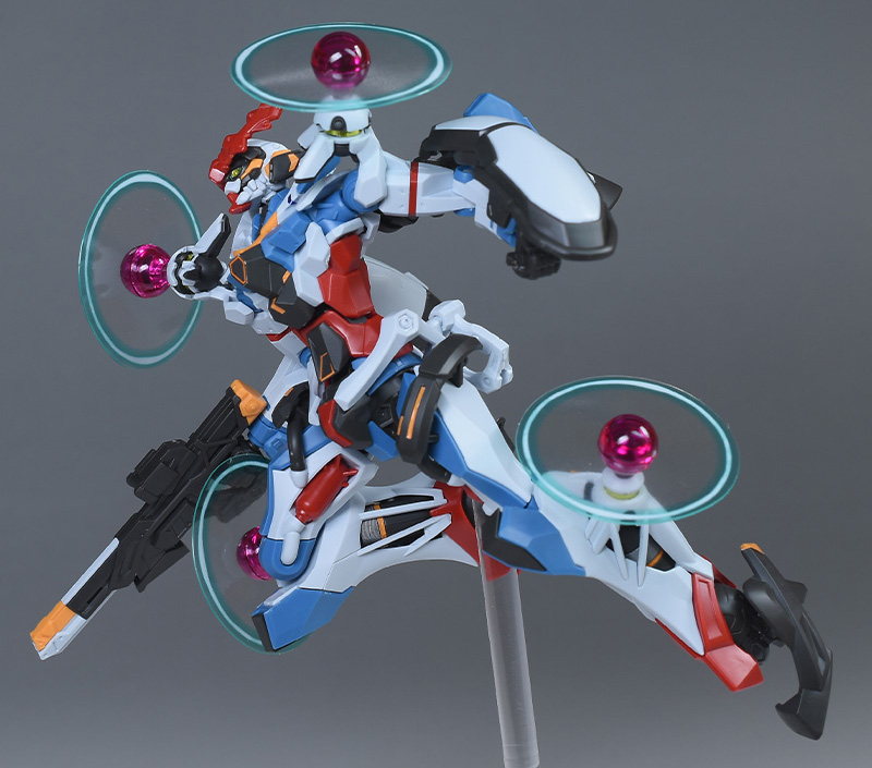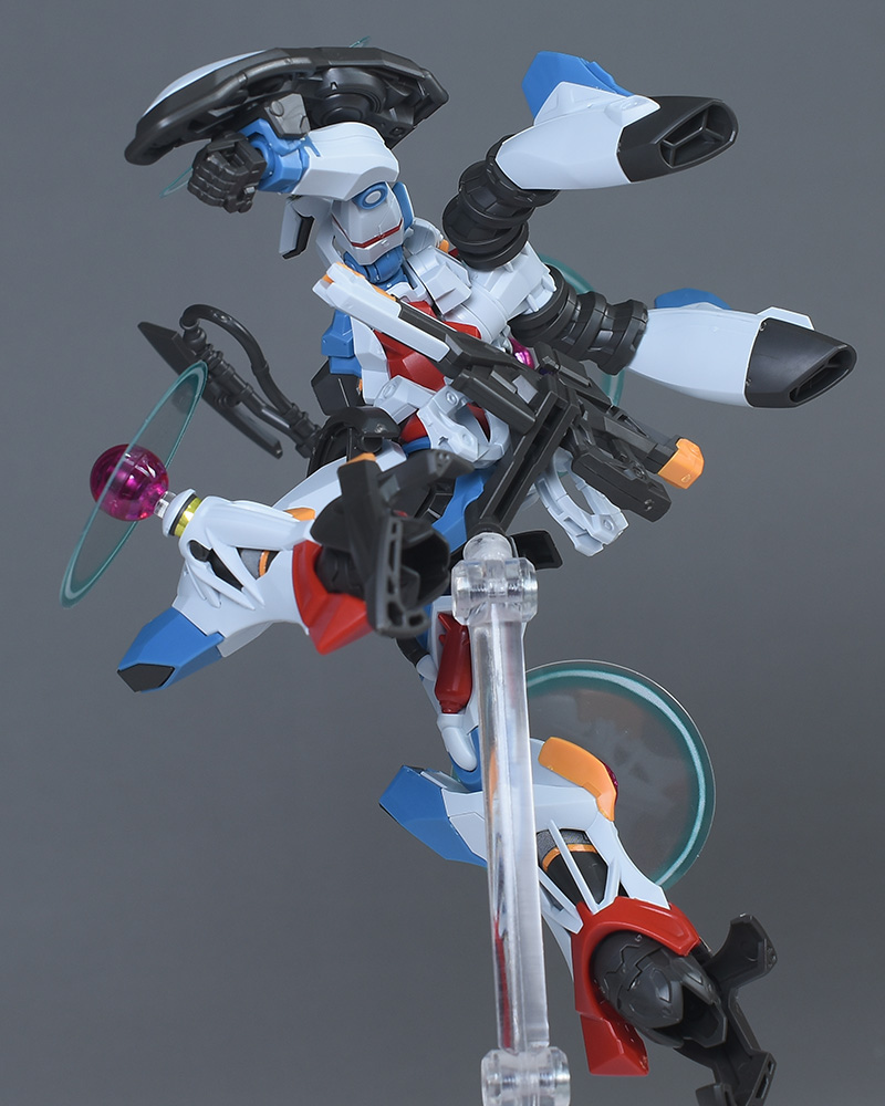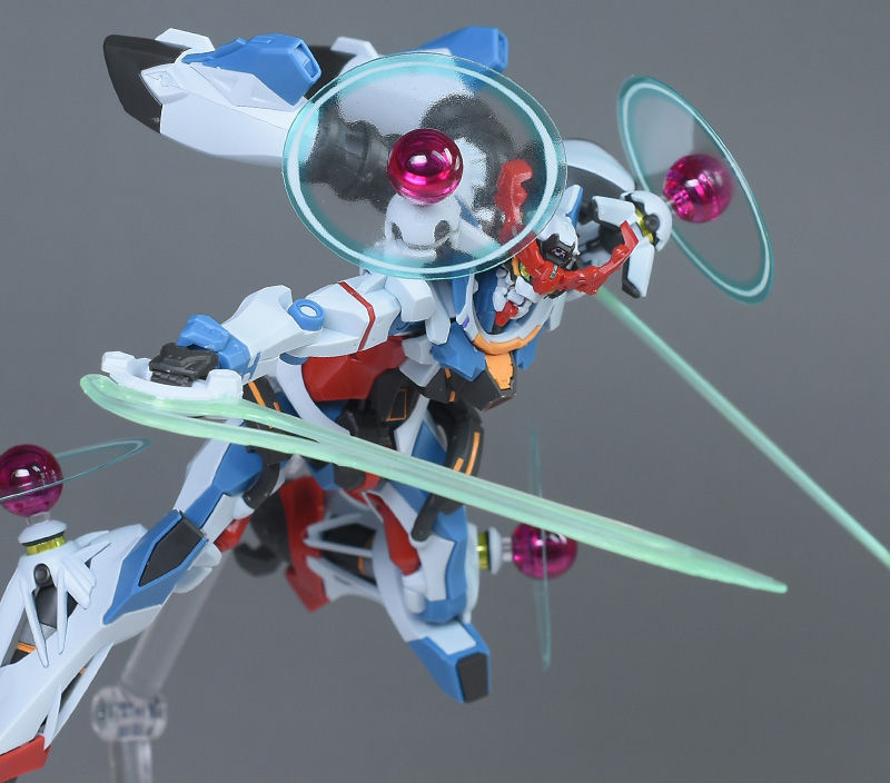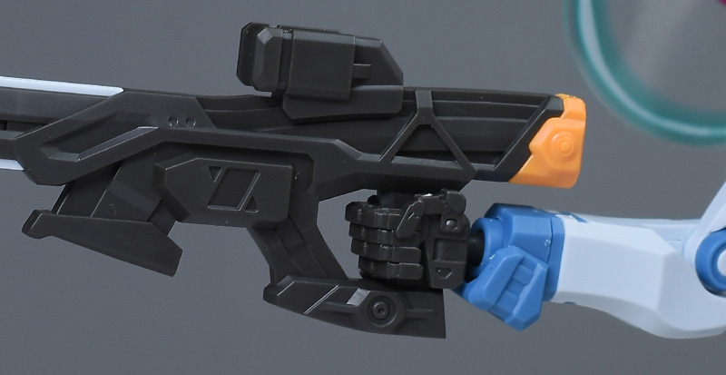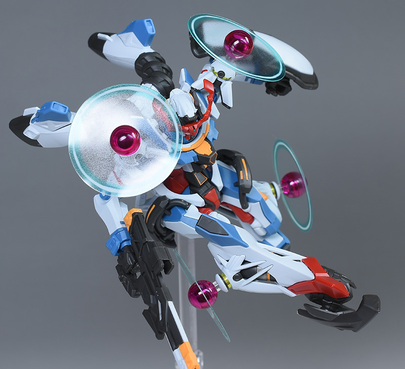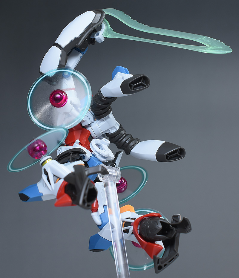 成形色はベースのHG GQuuuuuuXと同じ。少しくすみのあるホワイトを基調に、各部にブルーやレッド、イエローを配色。内部や関節、ビームライフルなどはダークグレー成形色での再現となっています。円形エフェクトの基部はクリアピンク成形色での再現。
