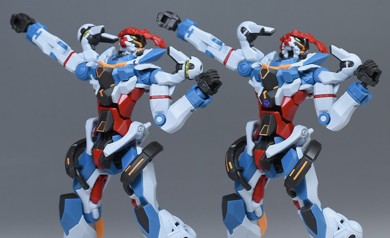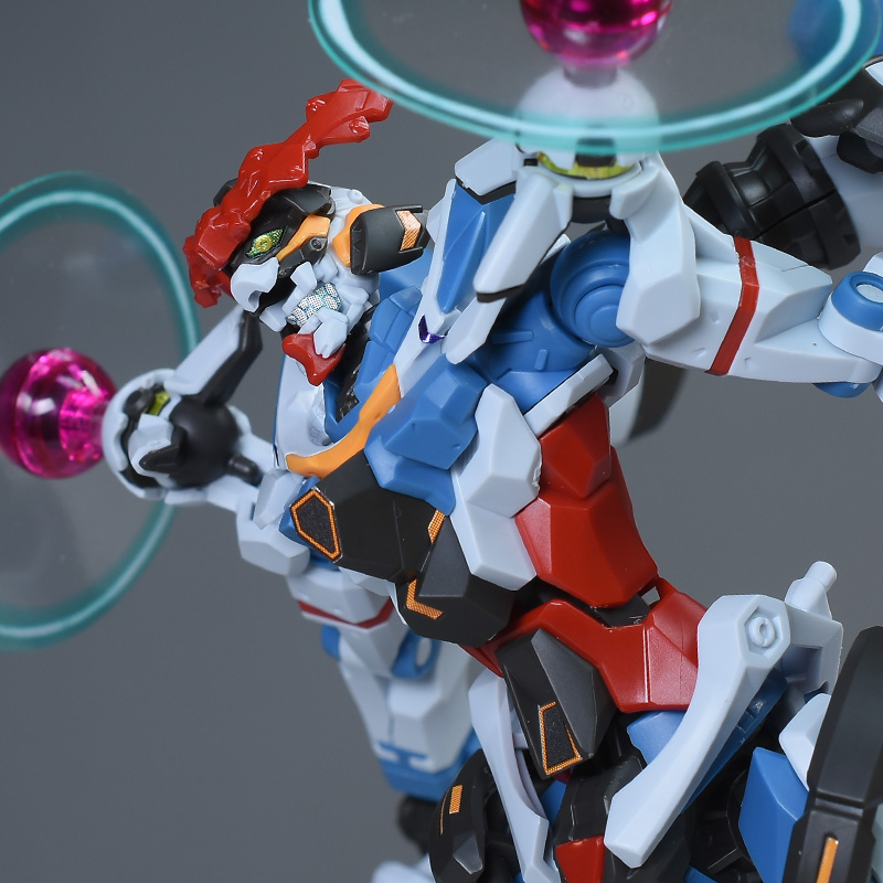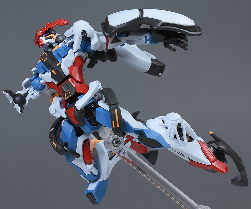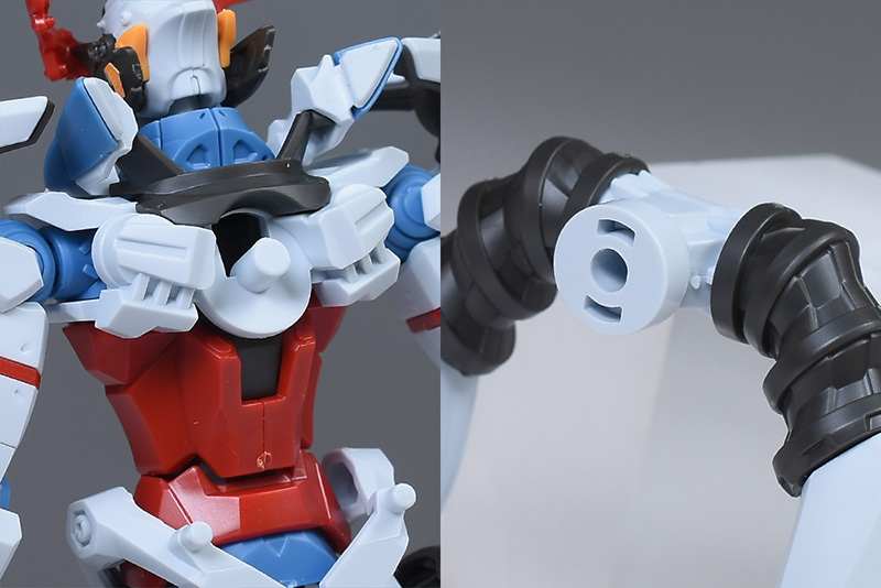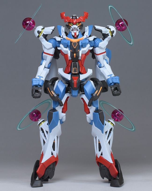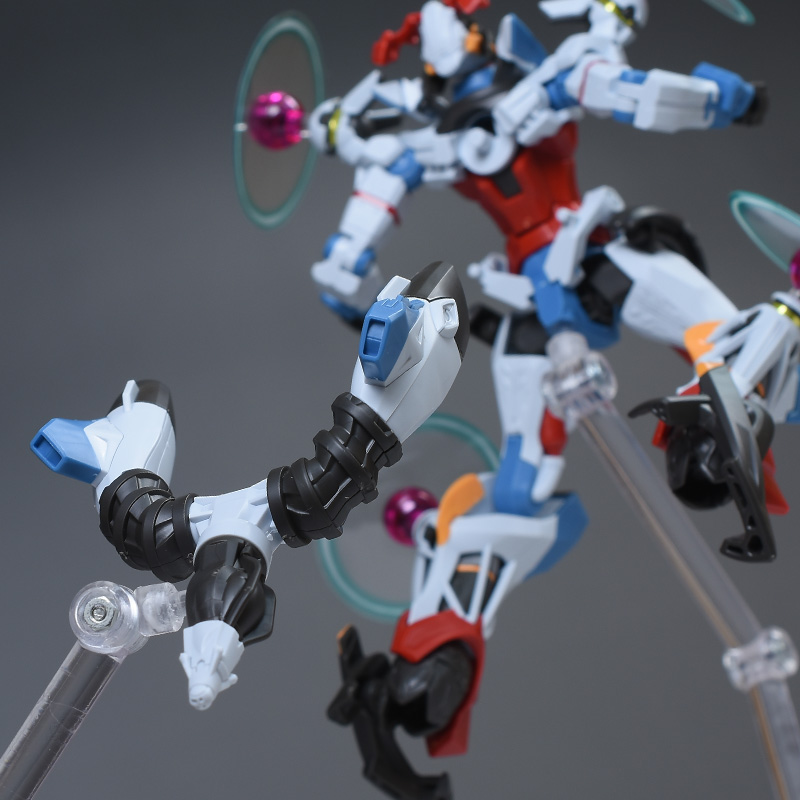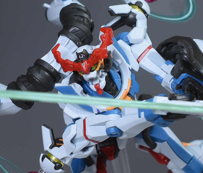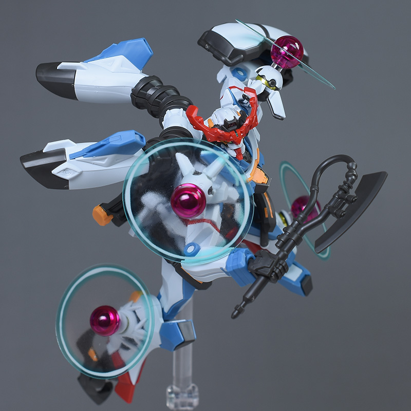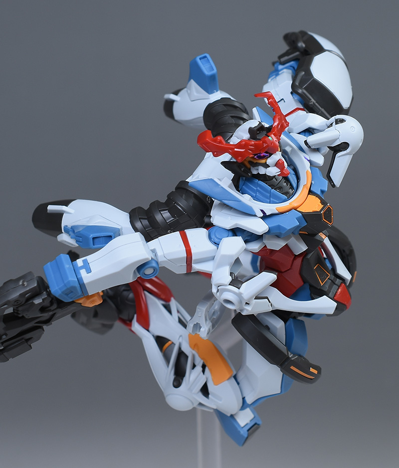 成形色はベースのHG GQuuuuuuXと同じ。少しくすみのあるホワイトを基調に、各部にブルーやレッド、イエローを配色。内部や関節、ビームライフルなどはダークグレー成形色での再現となっています。円形エフェクトの基部はクリアピンク成形色での再現。