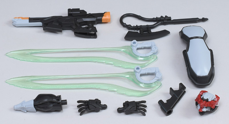 ビーム・ライフル、シールド、トメノスケ・ヒート・ホーク、平手(左右)、ビームサーベル(柄、エフェクトパーツ)✕2、背部コア・ファイターの機首パーツ、「オメガ・サイコミュ」起動前の頭部、ディスプレイ用(ビーム・ライフル懸架用)ジョイントパーツが付属。
