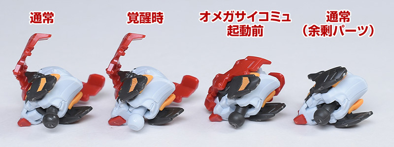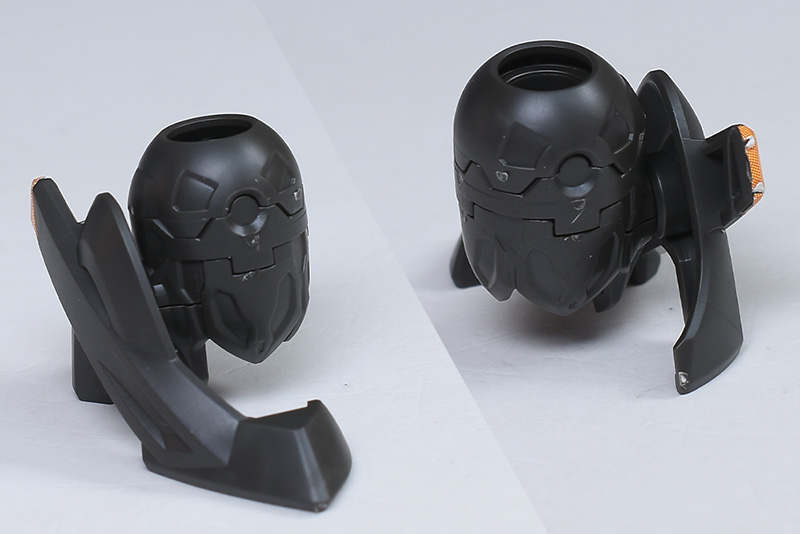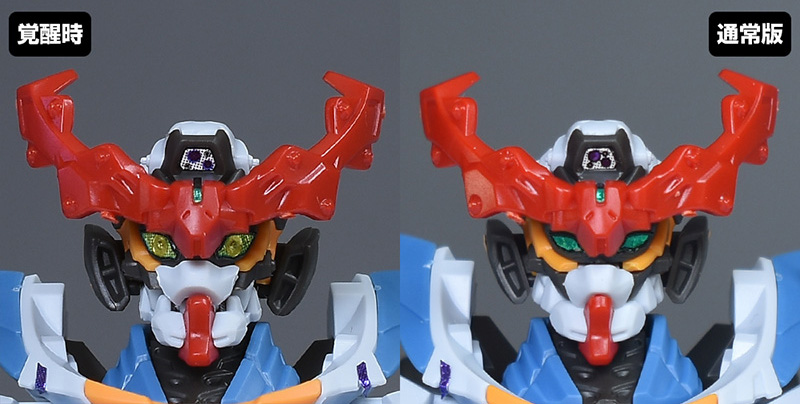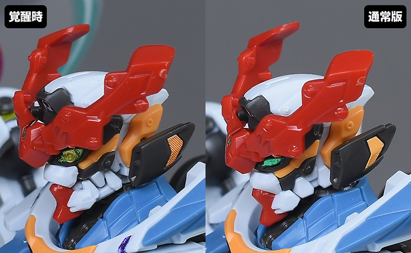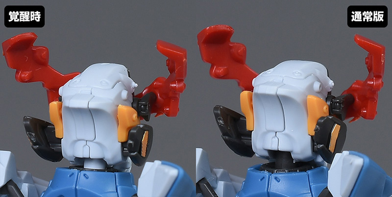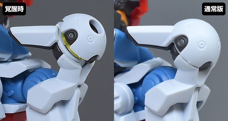 頭部を通常版と並べて比較。頭部は全体がエンディミオン・ユニット覚醒時用に新造。口が開口できるようになり、鼻周りや口などの形状も細かく違っています。ツインアイもグリーンからイエローのものに変化。目を見開いたようなサイズ感のあるものに変化しています。アンテナのみ通常版からの流用。
