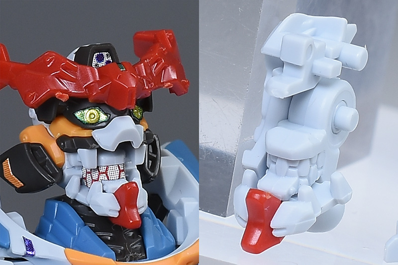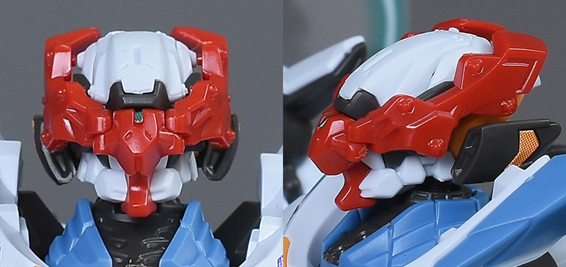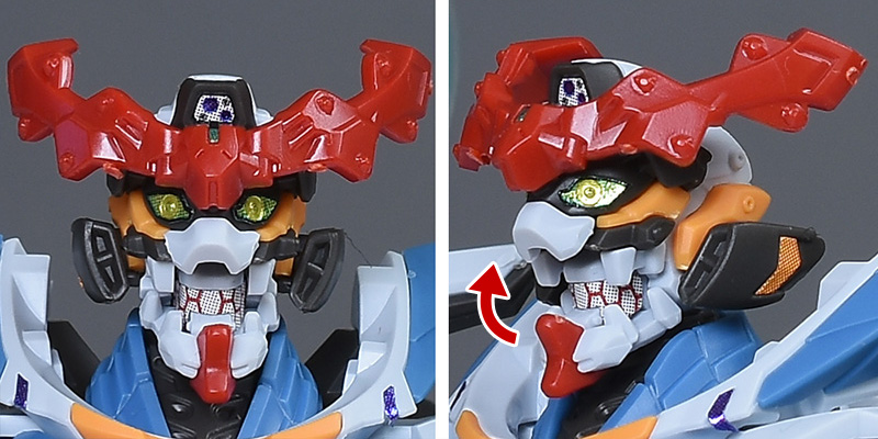 頭部を持ち上げることで口が開口。エヴァンゲリオンを思わせる凸凹歯と、内部のモールド入りのユニットが特徴的に造形されています。口を開くことで、吠えたような容姿に変化。