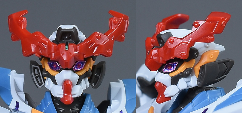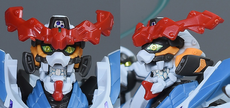 口を開いた状態で。口を開くと吠えているような感じにもなりますし、ゴールドの見開いたようなツインアイによって禍々しさ、荒々しさのある容姿に変化します。
