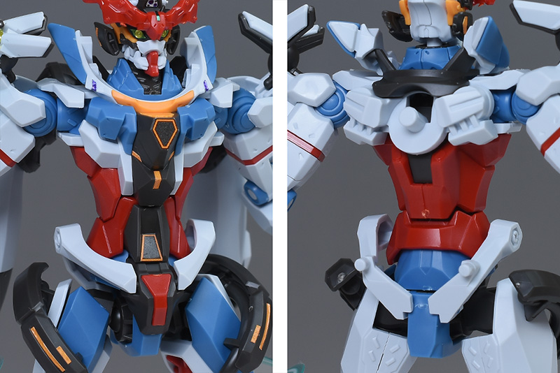 胴体部は通常版と同じ。逆三角形のスタイリッシュなシルエットで、各部がパーツで細かな色分けや緻密な造形が再現されています。ダークグレーの装甲部分はシールで細かく色分けします。腰部もフレーム状でアーマーとの干渉がない軽装スタイル。