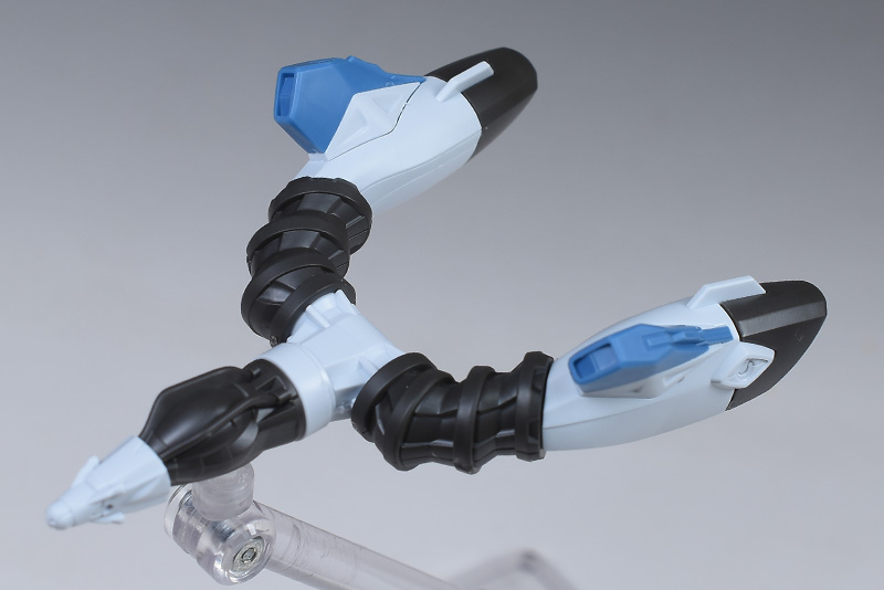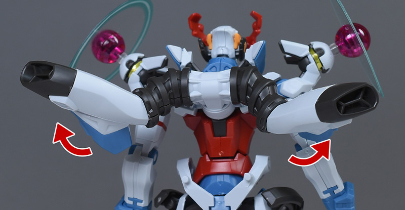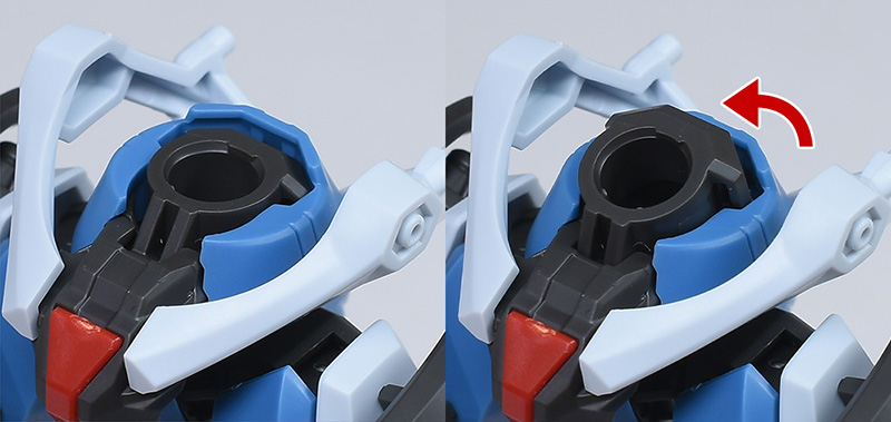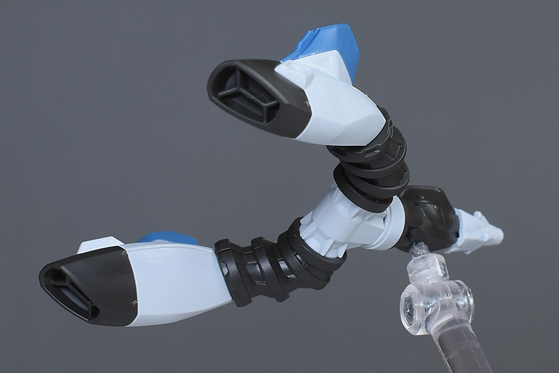 スラスターは蛇腹接続の各部がロールし、様々な表情を付けることができます。本体への接続部は1軸仕様でロールするので、バックパックを反転させることも可能です。