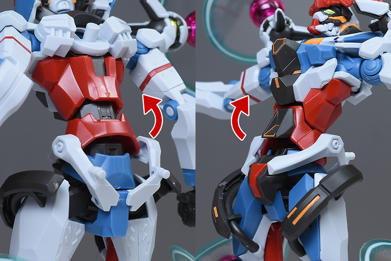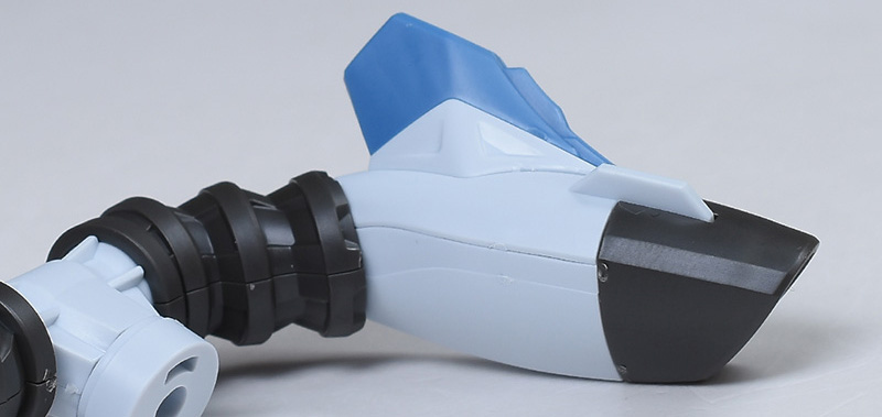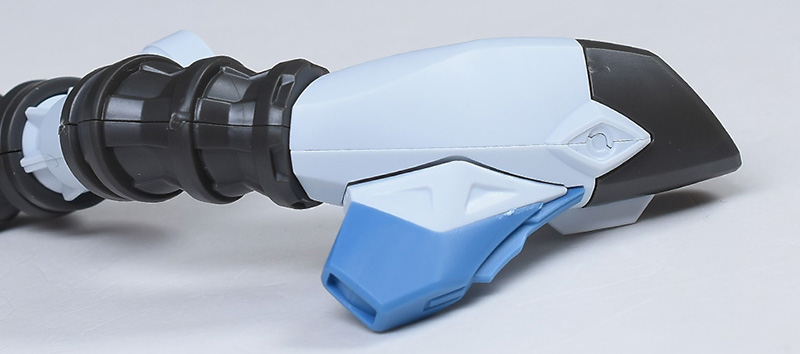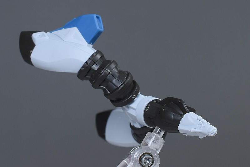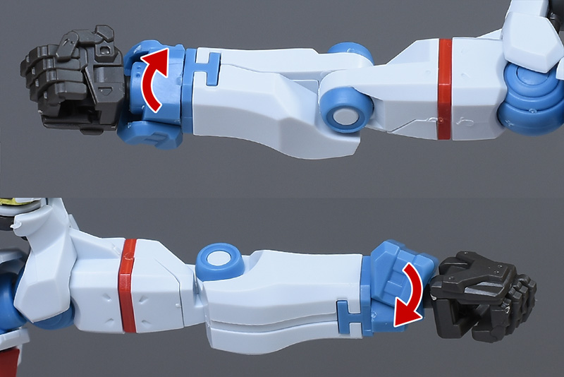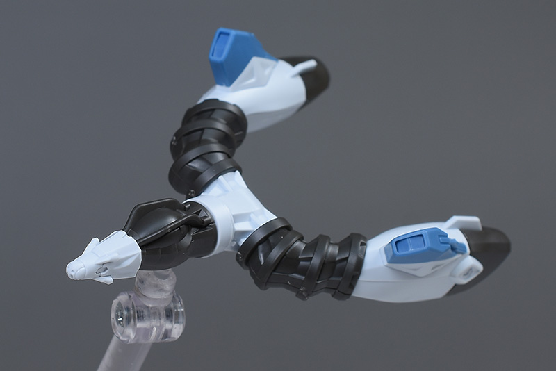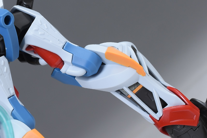 上腕は合わせ目ができないパーツ構成。赤いラインがオシャレにデザインされています。前腕は左右の組み合わせですが、前後の合わせ目は段落ちモールド化。手首の青い装甲はロール可能。手甲の一部は青く塗り分けが必要です。