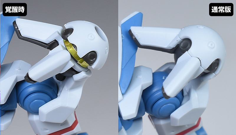 肩部を通常版と比較して。肩部の装甲は覚醒時用に一部パーツが新造。白いカバーが展開し、内部のゴールドが露出した状態になっています。ゴールドはシールでの色分け。
