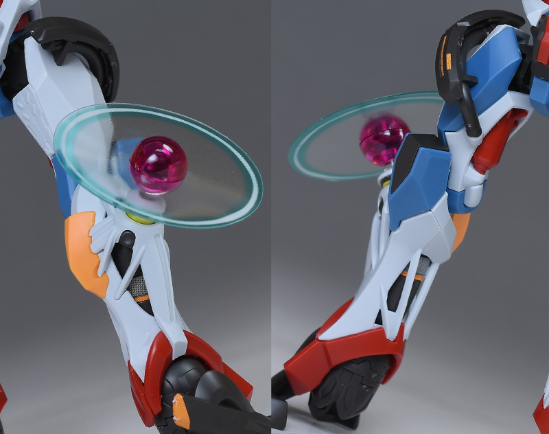 腕部。大部分は通常版と同じですが。肩はエンディミオン・ユニット覚醒時の円形エフェクトが展開した状態。ジークアクス自体がだいぶ奇抜ですが、円形エフェクトによってより特殊な容姿に変化しています。