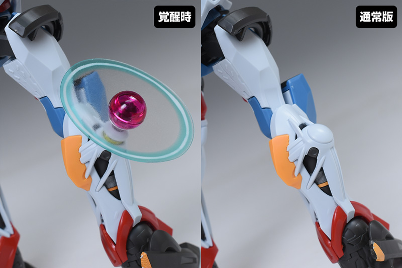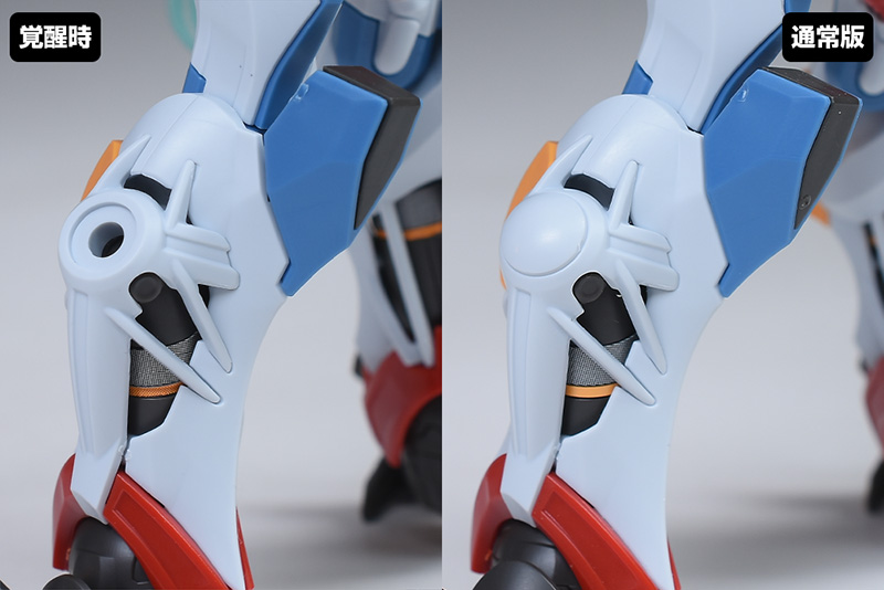 脹脛の部分を通常版と比較して。こちらも肩部と同様、覚醒時用に一部のパーツが新造。内部のゴールドが露出した状態になっています。白いカバーパーツはバラけるため、円形エフェクト側に組み付けるようになります。脚部に蓋がしたい場合は余剰パーツを使用します。