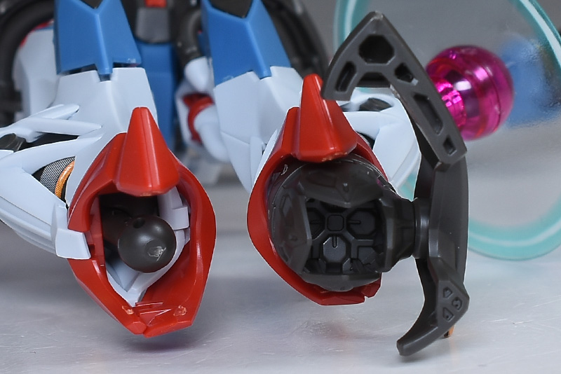 脚部。こちらも腕部と同様、大部分は通常版と同じですが、脹脛はエンディミオン・ユニット覚醒時の円形エフェクトが展開した状態。カラフルで奇抜な造形、奇抜なデザインで、フレームやパイプ、タンクが造形されるなど、これまでのガンダムにはない密度感ある造りになっています。
