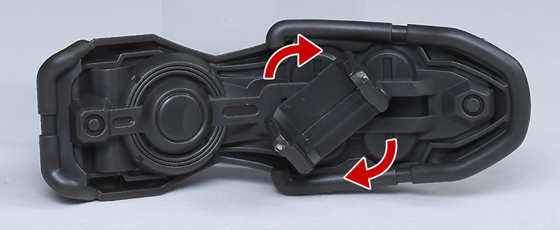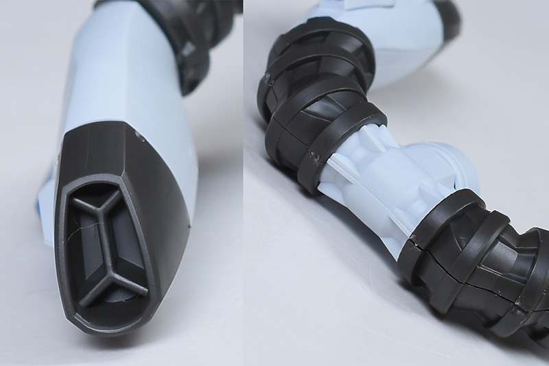 脚裏は肉抜き穴ですが、デザイン風に抜かれているため、そのままにしておいても良さそうです。スラスターは内側にも細かなモールドが造形されています。