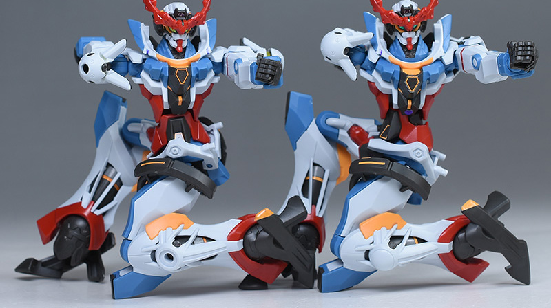円形エフェクトも存在感があり、通常版とはきっちりと差別化できていますし、これがあることでポージングでも重厚感が感じられてより格好良く表現することができます。多少の干渉はあるものの、ポージングをとても豊かにしてくれますし演出の幅も広がります。その他暴走状態のツインアイや通常の頭部も付属するなど、何気に劇中のジークアクスの容姿を抜け目なくカバーできるのが良いですね。