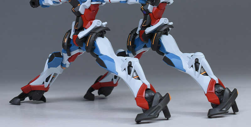 ソール部はヒール状の蹄鉄のようなデザインで造形。中央は楕円球状のスラスターがメカニカルに造形されています。後部装甲の一部はオレンジのシールでの色分け。