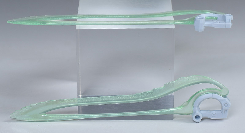 ビームサーベル。腰部後方に装備するメガ粒子循環式ビーム・サーベルです。こちらも通常版のものと同じ。内部がくり抜かれた状態のビーム刃は偏光成形で、角度を変えると少し虹色に光ります。