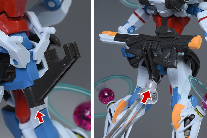 新規付属のジョイントパーツを股間部に組み付けることで、ビーム・ライフルを背部にマウントすることができます。ジョイントパーツには3.0mm穴があり、アクションベースやスタンドでのディスプレイにも対応しています。