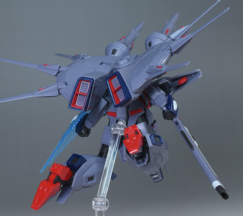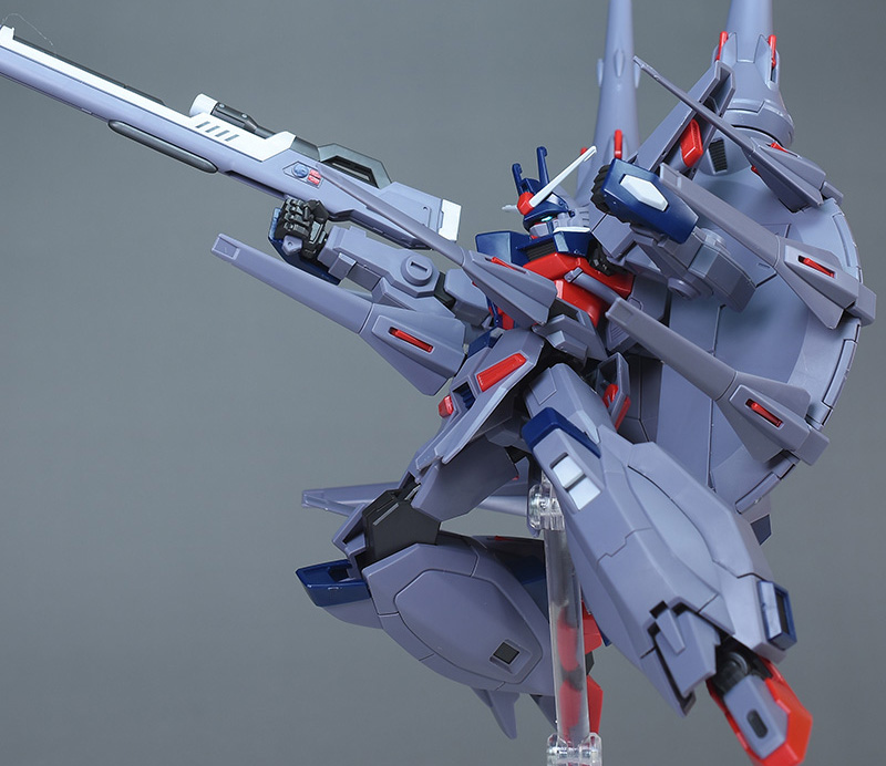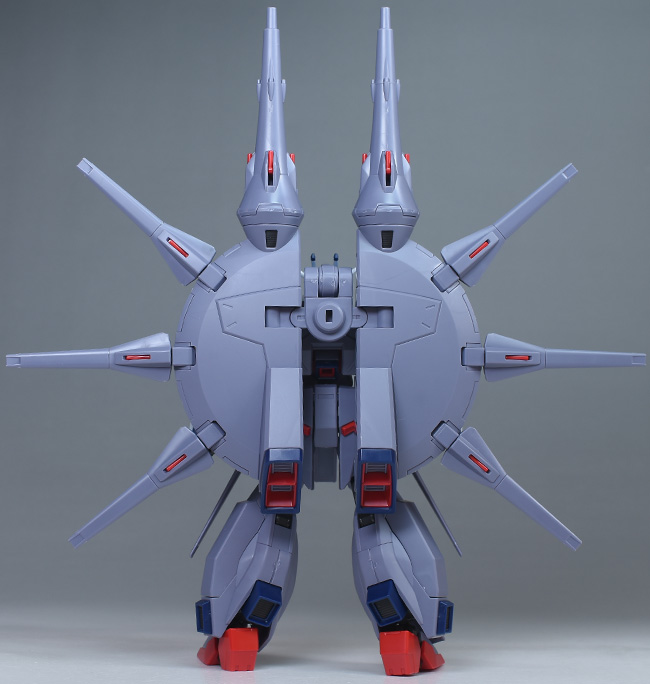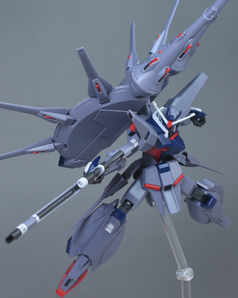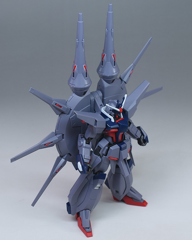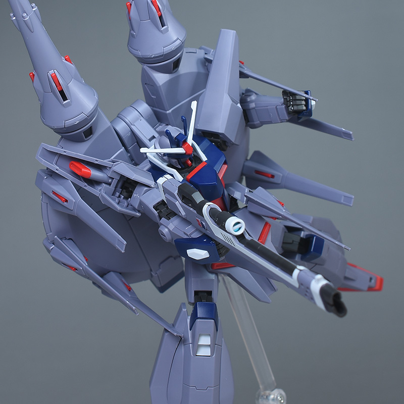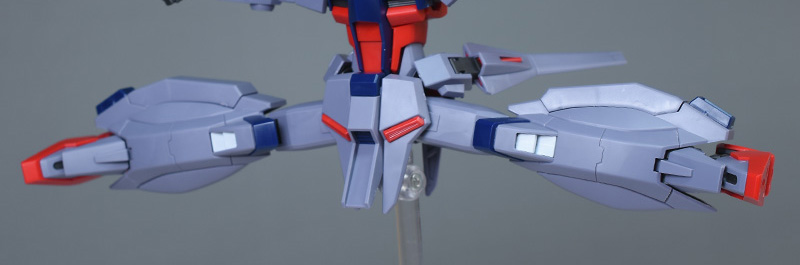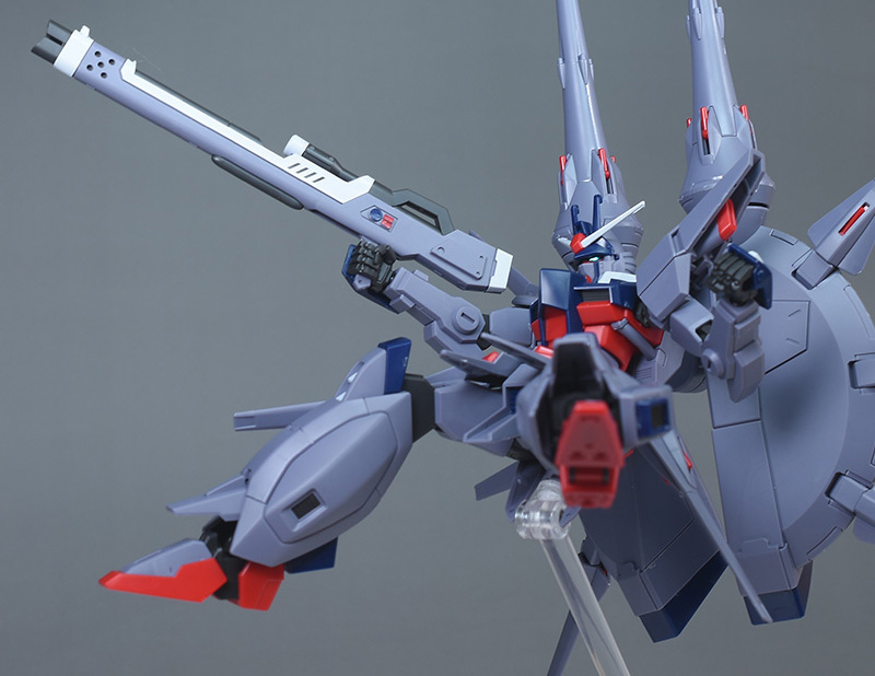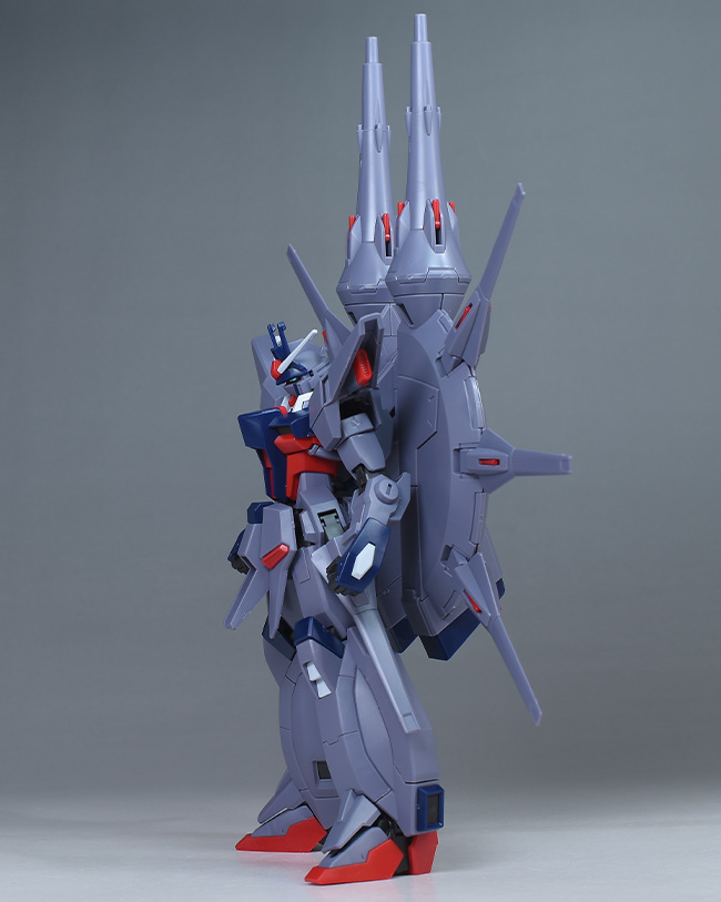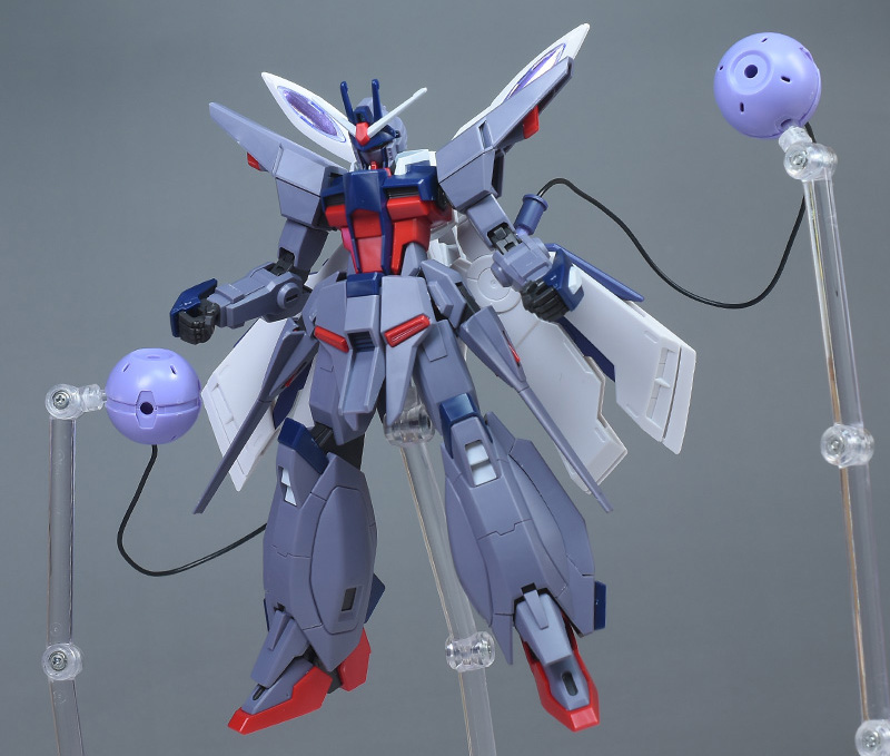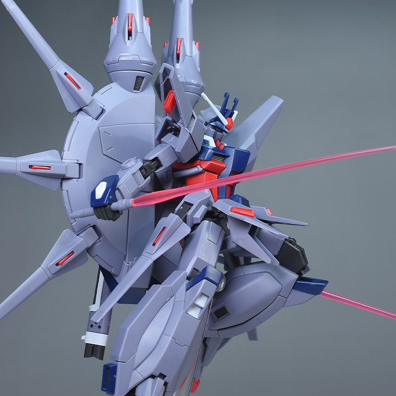 成形色はパープルグレーを基調に、胸部や膝部などにダークブルー、腹部やソール部、スラスター口、ドラグーン(突撃ビーム機動砲)の一部など各部にレッドを配色。その他、頭部アンテナや襟がホワイト、内部や関節がダークグレー成形色での再現となっています。