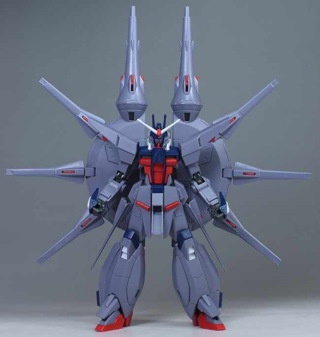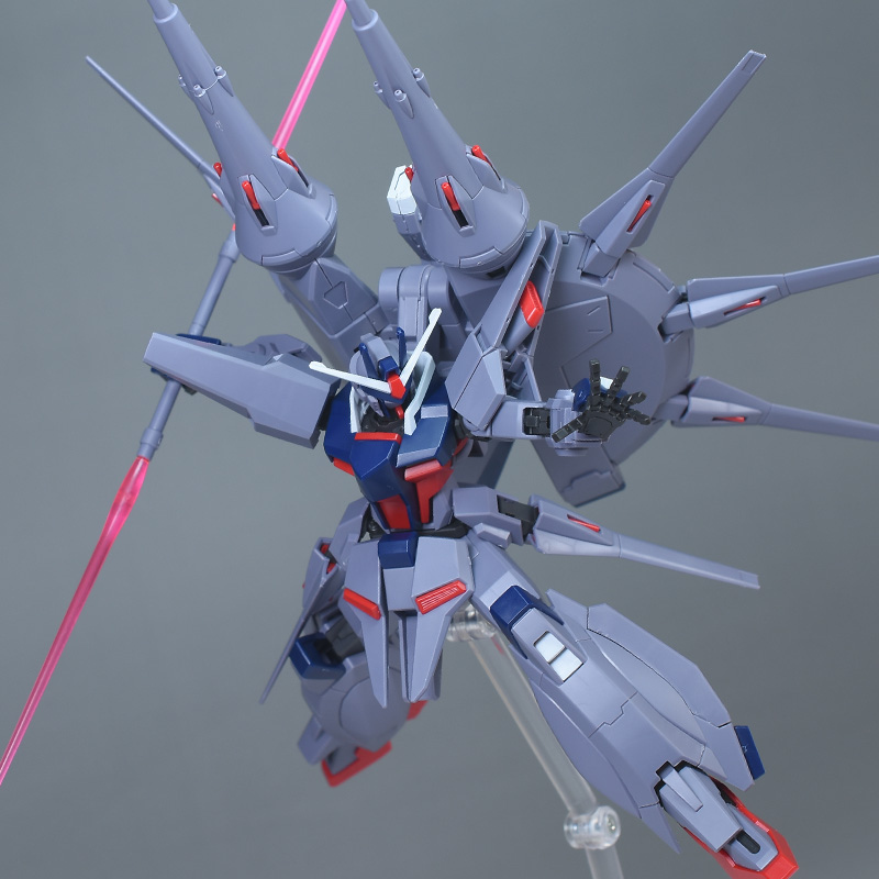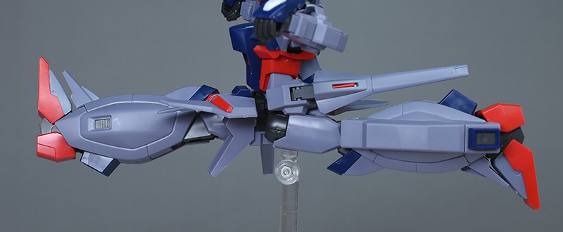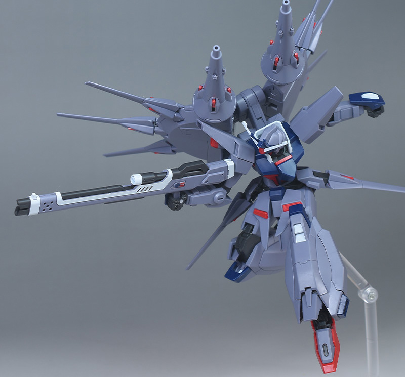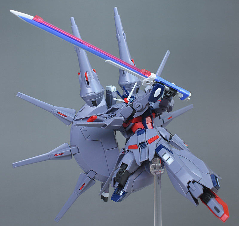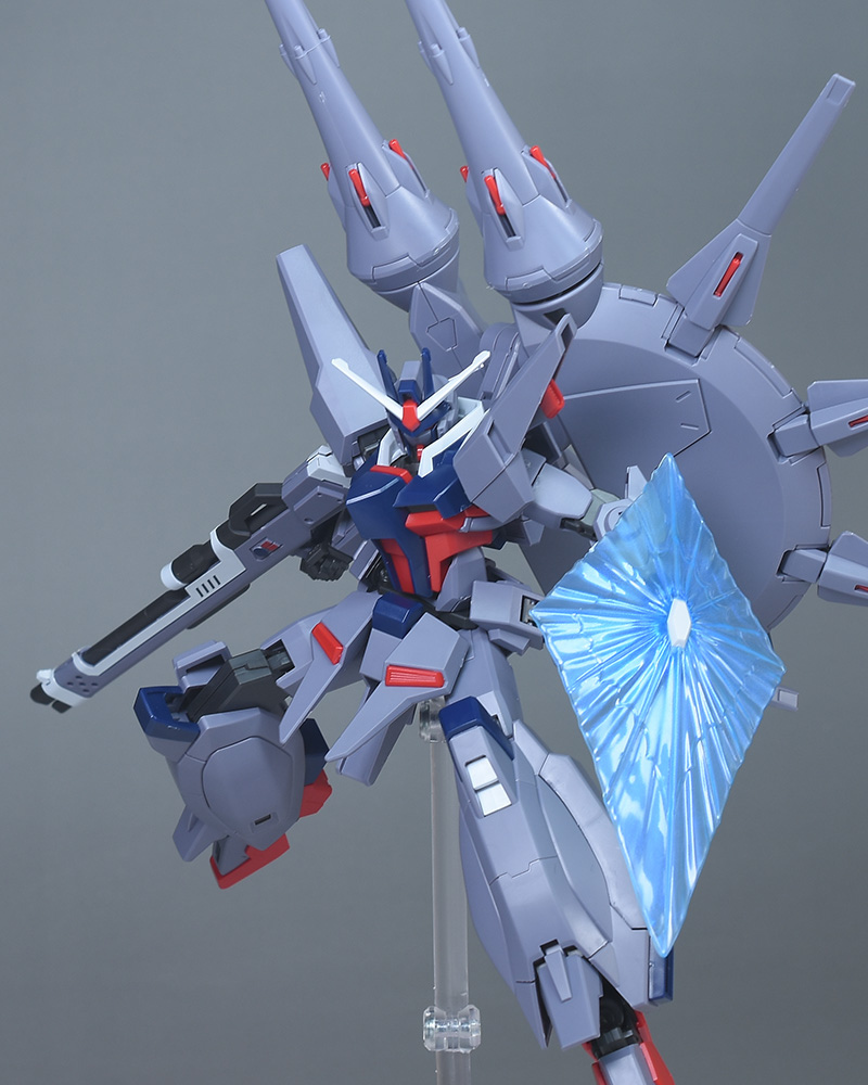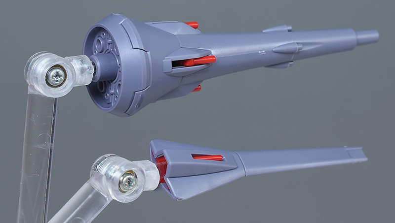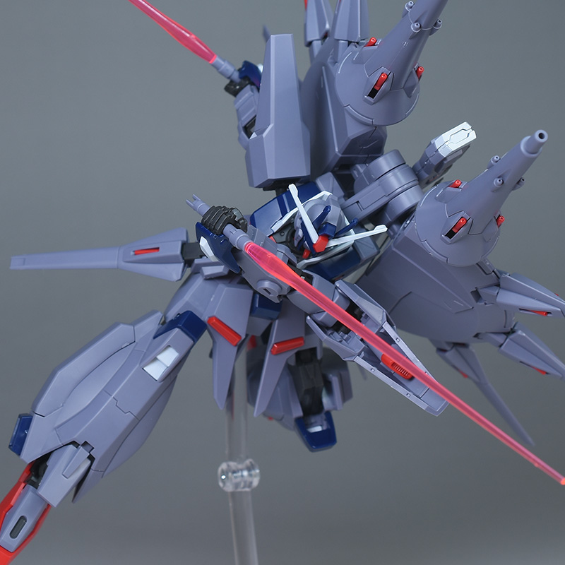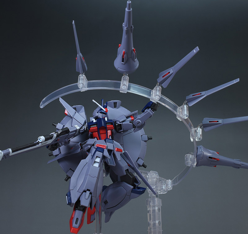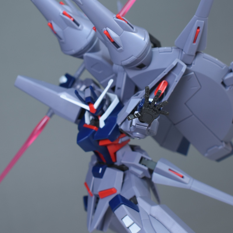 成形色はパープルグレーを基調に、胸部や膝部などにダークブルー、腹部やソール部、スラスター口、ドラグーン(突撃ビーム機動砲)の一部など各部にレッドを配色。その他、頭部アンテナや襟がホワイト、内部や関節がダークグレー成形色での再現となっています。
