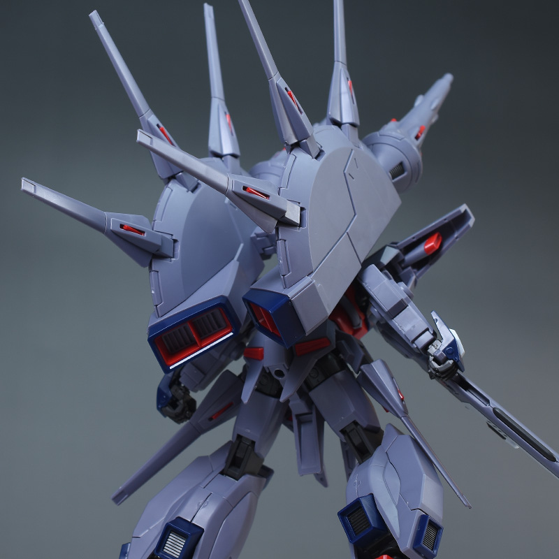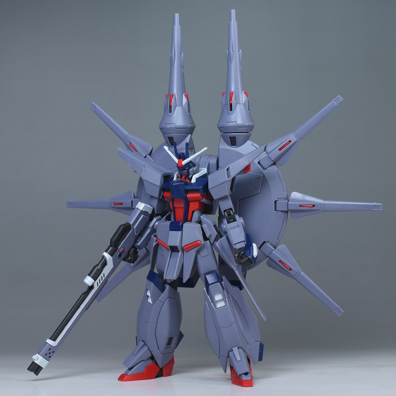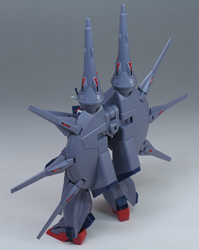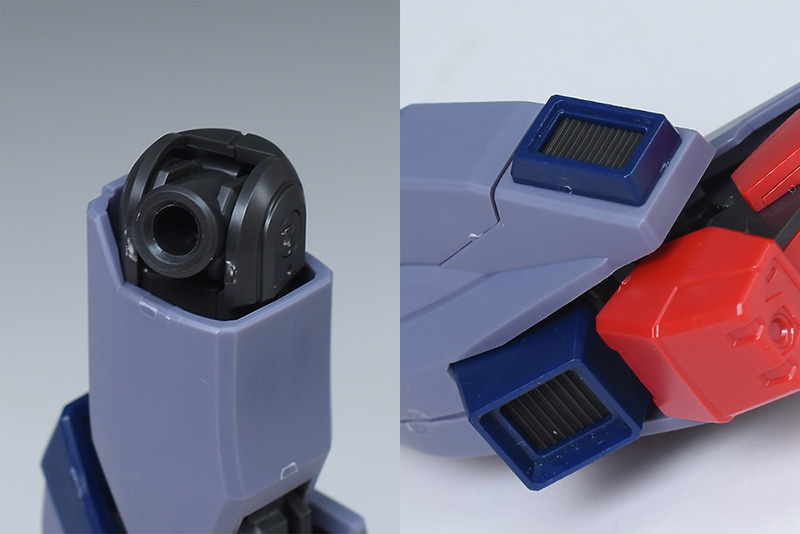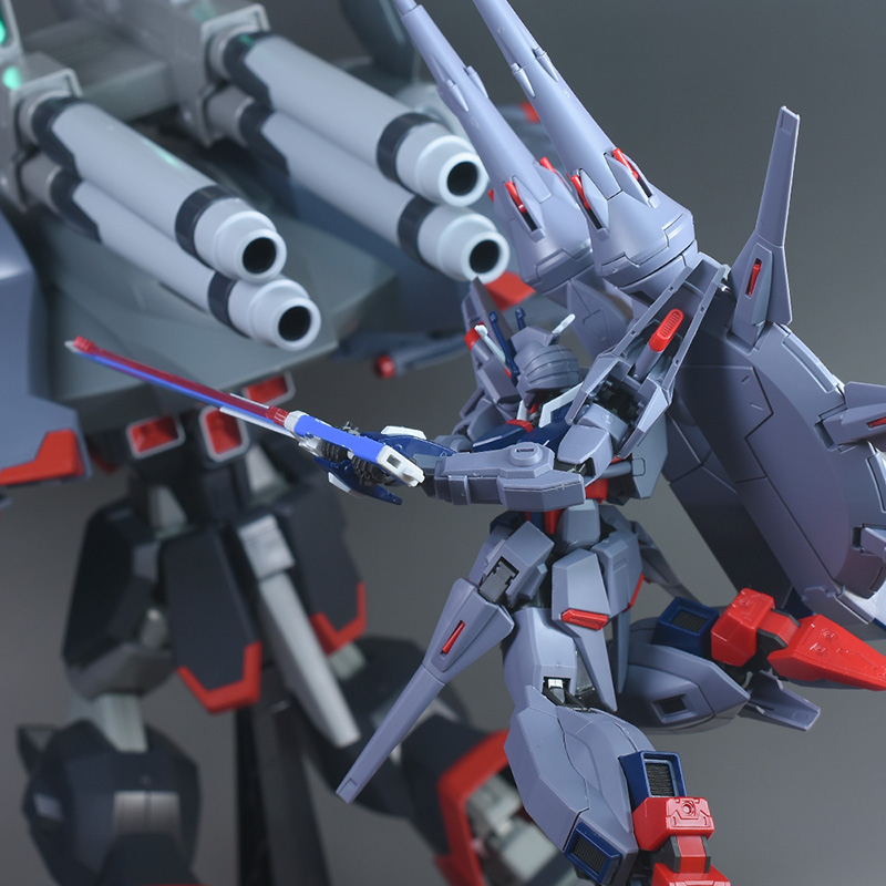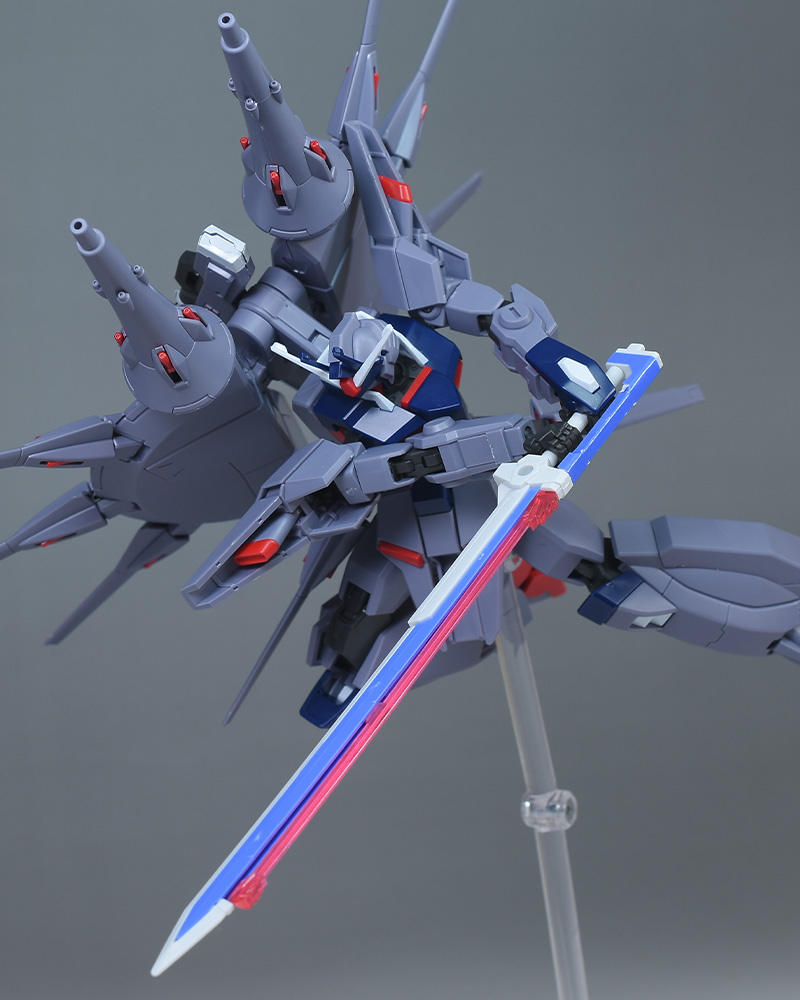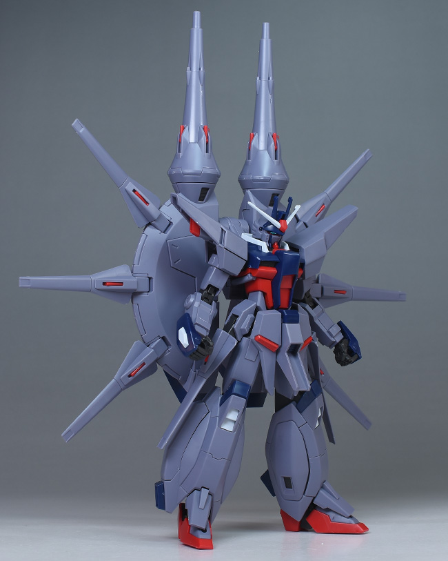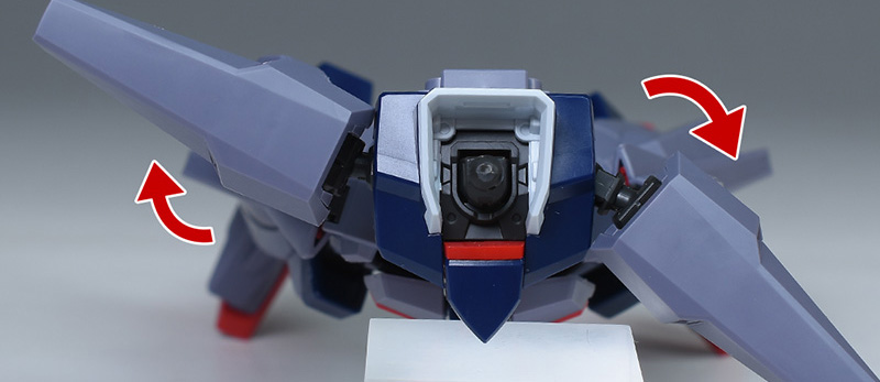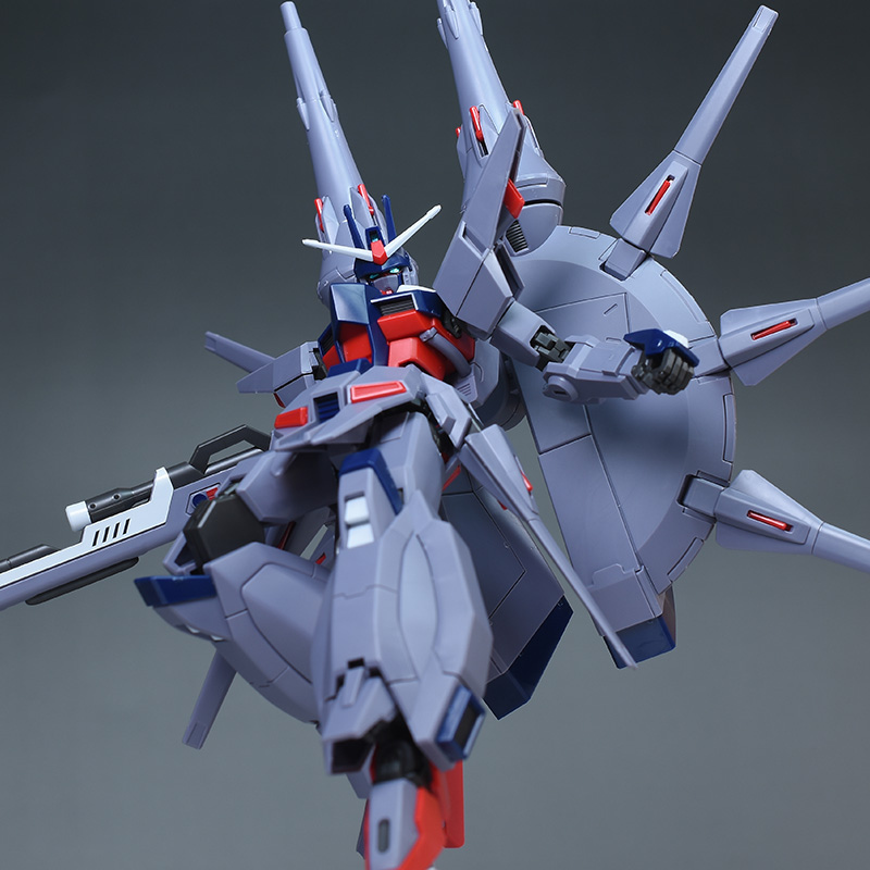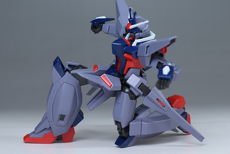 成形色はパープルグレーを基調に、胸部や膝部などにダークブルー、腹部やソール部、スラスター口、ドラグーン(突撃ビーム機動砲)の一部など各部にレッドを配色。その他、頭部アンテナや襟がホワイト、内部や関節がダークグレー成形色での再現となっています。