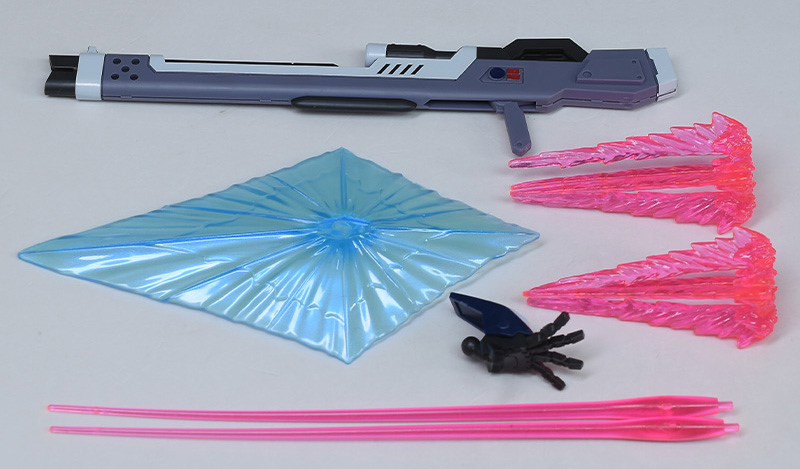 高エネルギービームライフル、ビームシールド、ビームジャベリン刃✕2、ビームスパイクエフェクトパーツ✕2、平手(左)が付属。