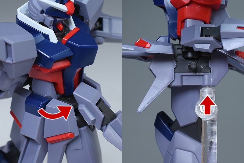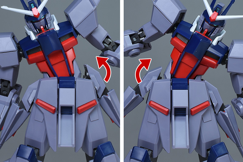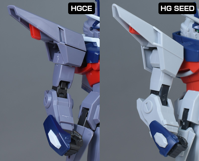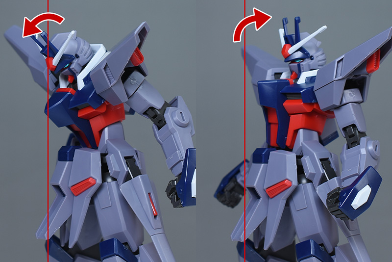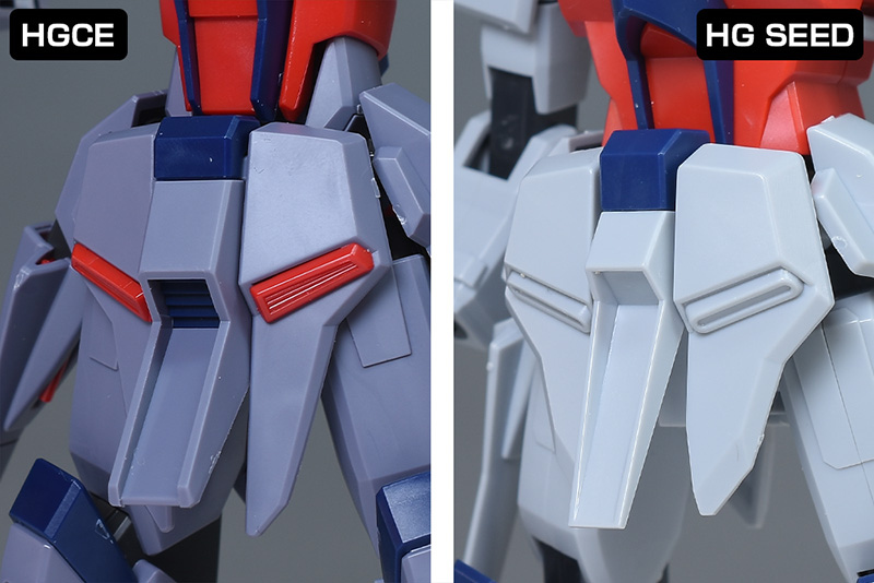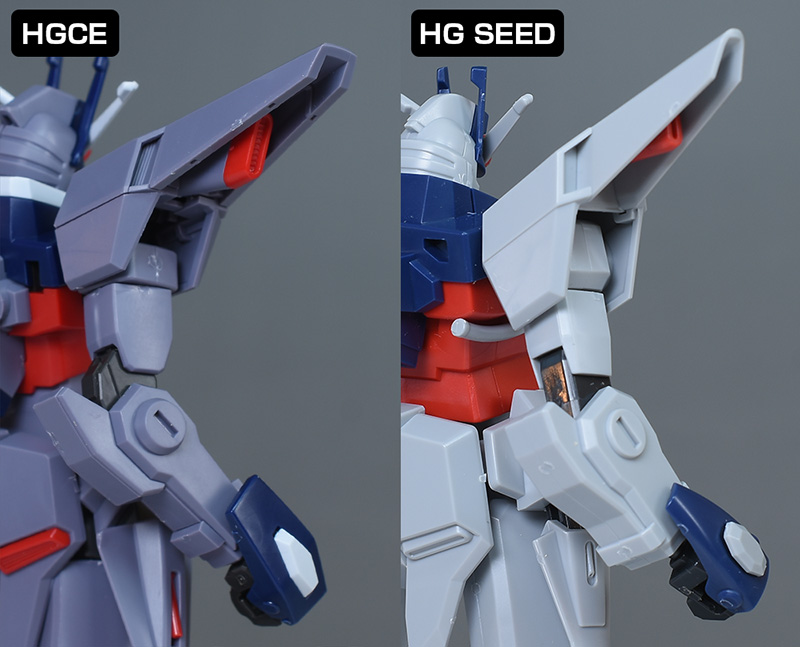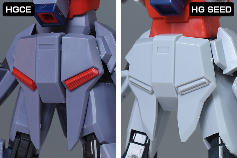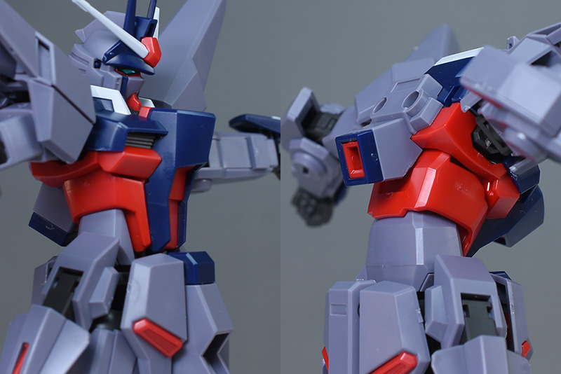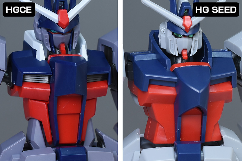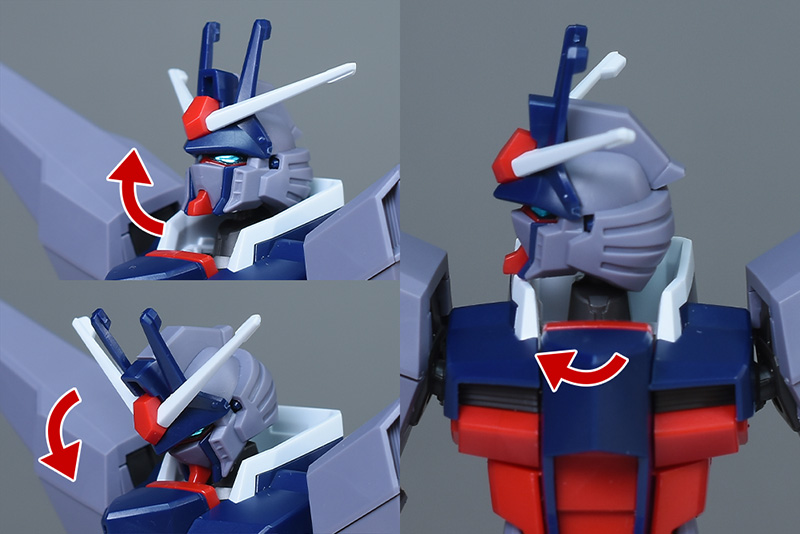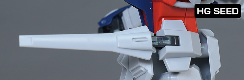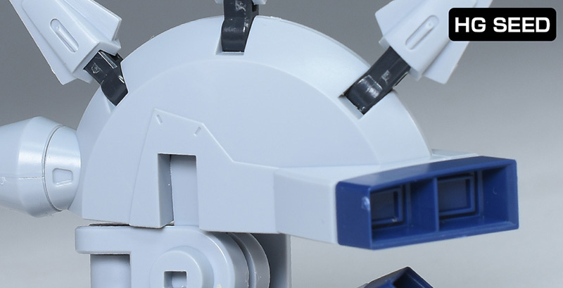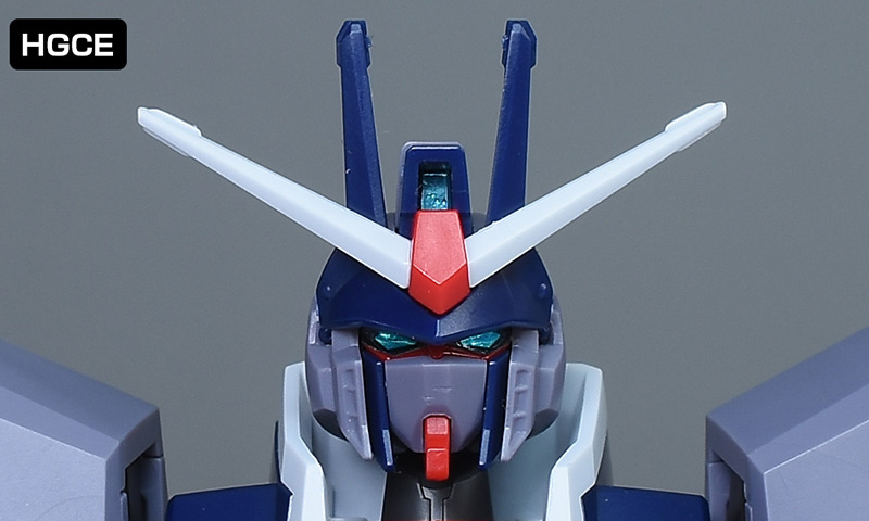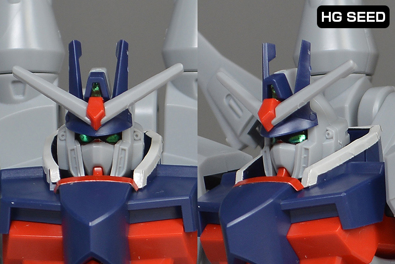 頭部は全体的にやや丸みのあるシルエットで造形。HG SEEDに比べ、ツインアイはキリッとした表情になり、への字スリットのないマスクも端正でクールな雰囲気を感じさせるものになっています。HG SEEDにはなかった頬の色分けもダークブルー成形色パーツで細かく再現。左右のダクトはグレーに塗り分けが必要です。
