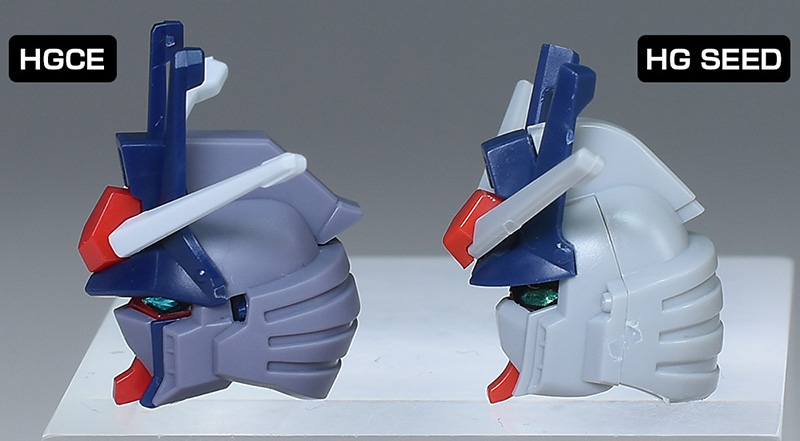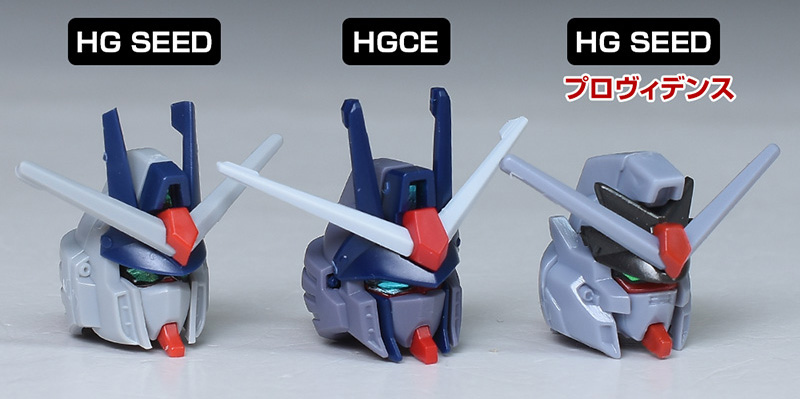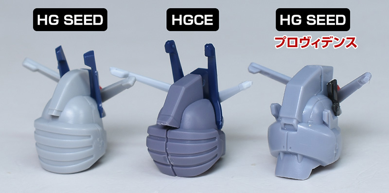 HG SEEDプロヴィデンスの頭部とも並べて。プロヴィデンスとはだいぶ異なり、ヒロイックなデザインに変化。メット部は左右の組み合わせですが、後頭部の合わせ目は段落ちモールド化されています。