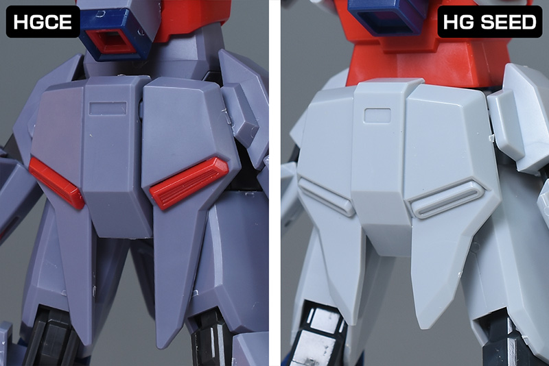 プラットフォームをHG SEEDのものと並べて比較。まず情報量が異なりますし、下部スラスターも内外がパーツで細かく色分けされていて完成度が高いです。