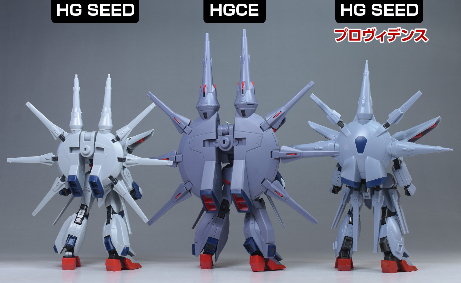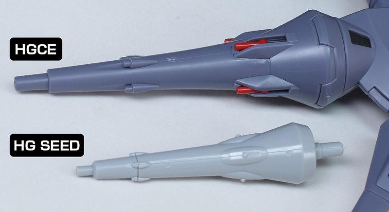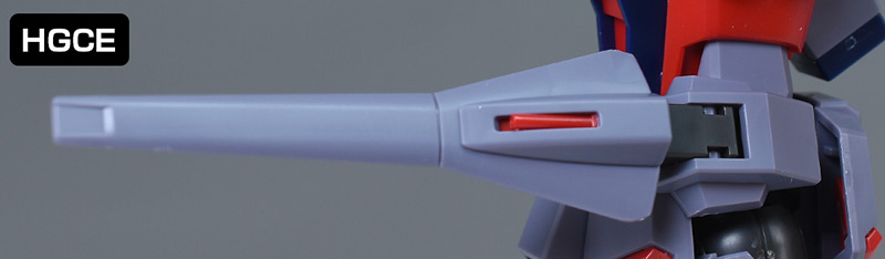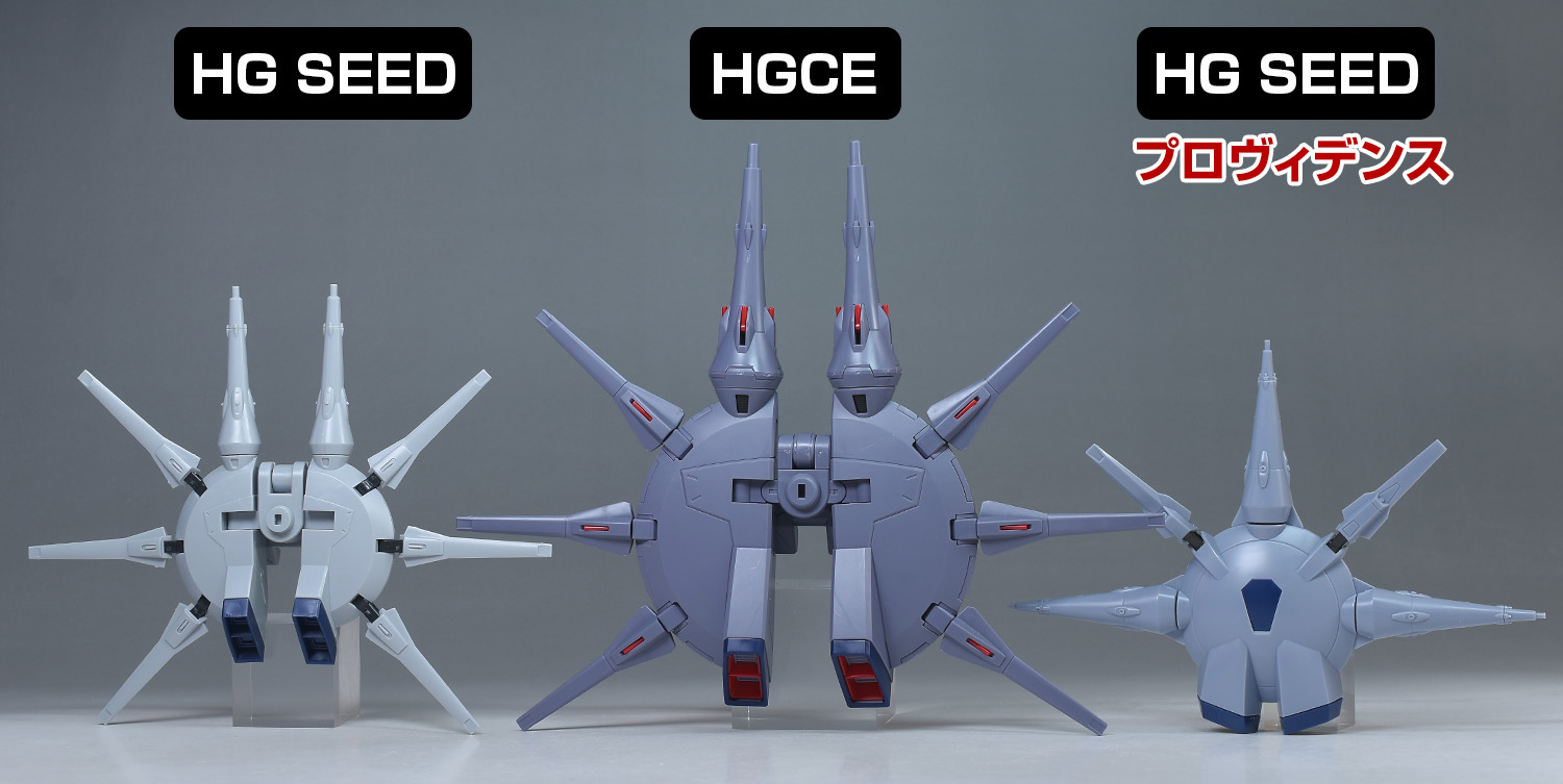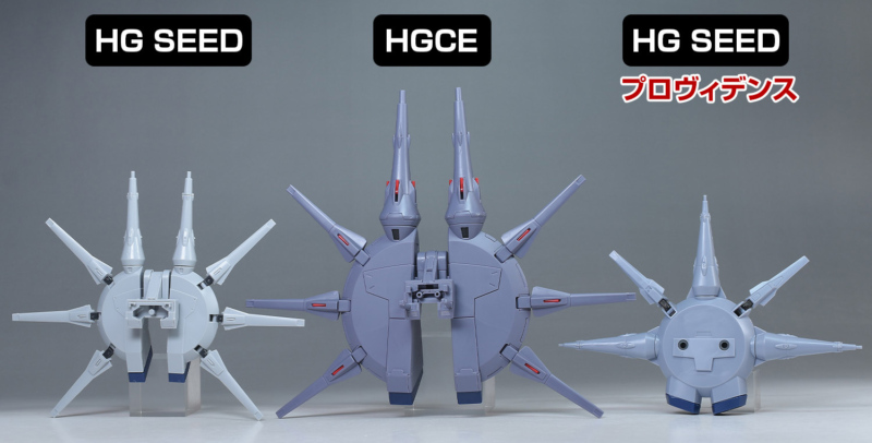 背部ドラグーンシステムをHG SEEDレジェンド、HG SEEDプロヴィデンスのものと並べて比較。円形のプラットフォーム、突撃砲各種までサイズ感が全く異なり、HGCEのものはかなり大型に造られています。プラットフォーム上部の大型ドラグーンが「GDU-X7 突撃ビーム機動砲」、側面に3基装備しているのが「GDU-X5 突撃ビーム機動砲」。