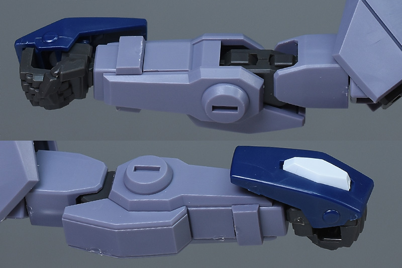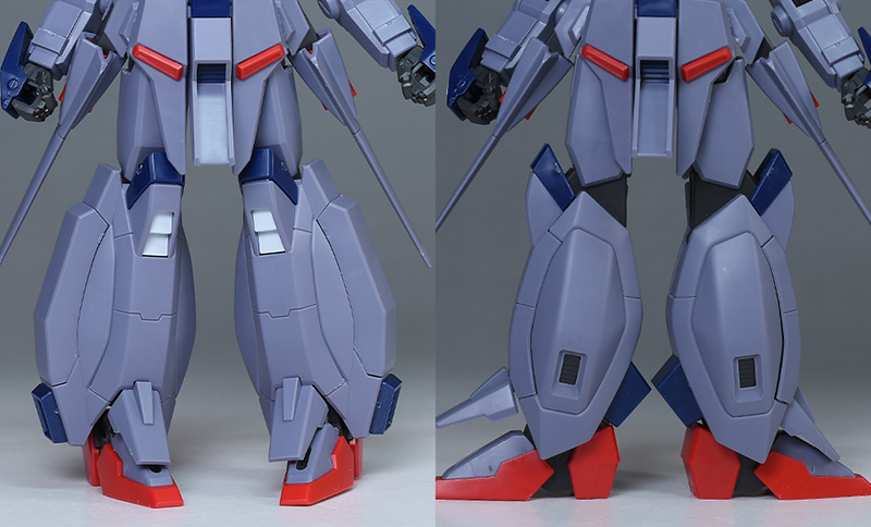 大腿部は筒型で合わせ目はなし。膝から下は前面と左右パーツの組み合わせですが、後部の合わせ目は段差、段落ちモールド化されています。