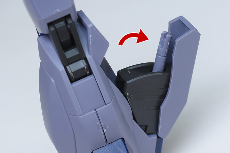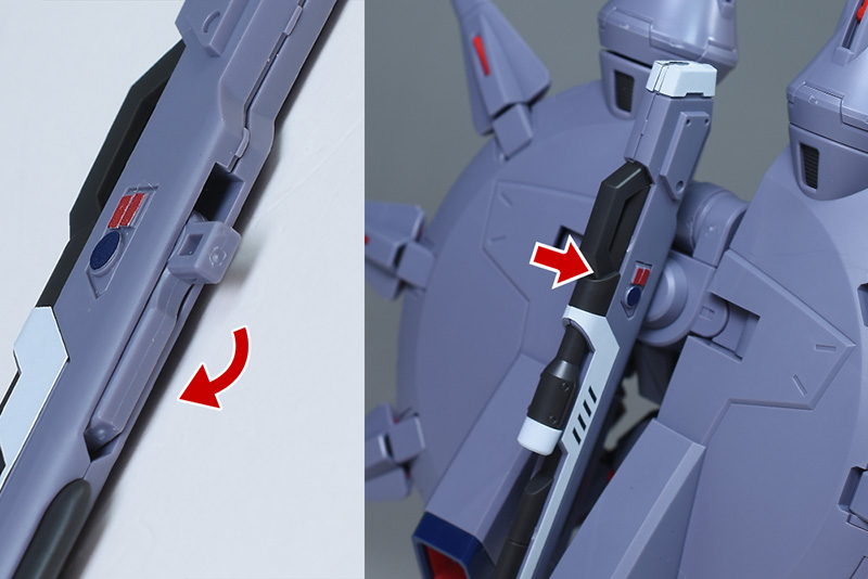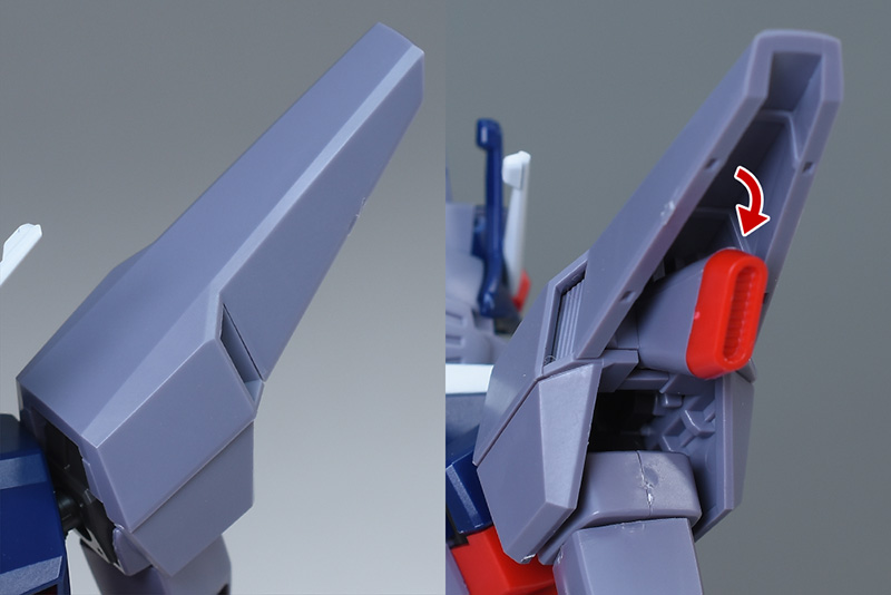 サイドアーマーにはGDU-X5 突撃ビーム機動砲を装備。腰との接続部はボールジョイントで柔軟に可動します。突撃ビーム機動砲は取り外しが可能。(バックパックのものと同じなので、詳細は後述します。)ダークグレーのヒンジに見える部分に可動ギミックはありません。