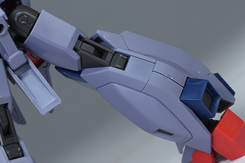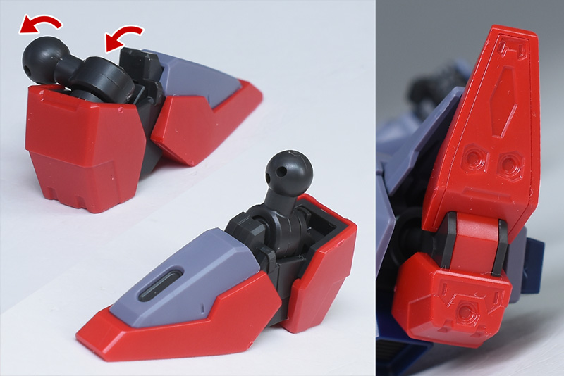 ショルダーアーマーは合わせ目が出来ないパーツ構成。側面のスラスター口は赤いパーツできっちり色分けされていますし、上下への可動ギミックもあります。左右のスリッドモールド入りダクトも内部が別パーツ化されているので塗り分けがしやすいかと。上腕との接続部分にだけ少し合わせ目ができます。