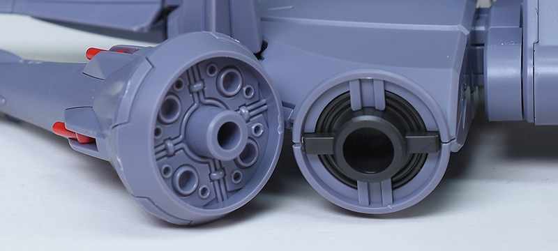 バックパックと本体とは角丸の4ダボ接続。更に動力パイプも連結されるなど、重量に負けない構造になっています。中央1基の角型スラスターは内外共にダークブルー、レッド、ダークグレーのパーツできっちりと色分けされています。ダークブルーの枠パーツは塗装してからはめ込むと圧迫で割れる可能性があるので注意。サフは吹かないほうが無難かと。