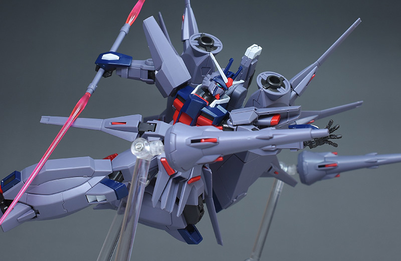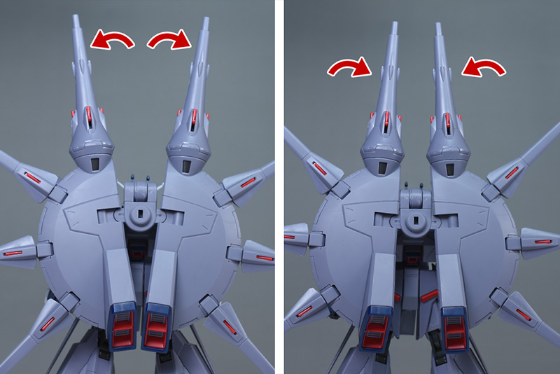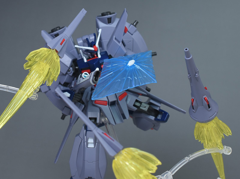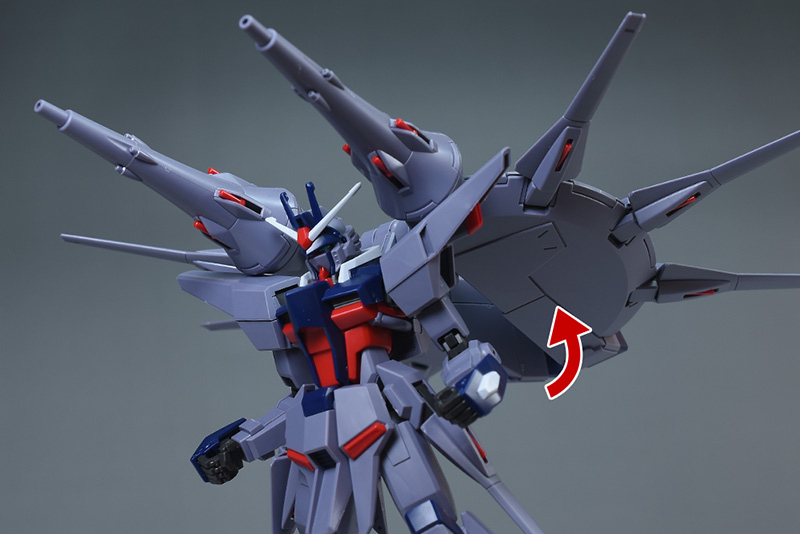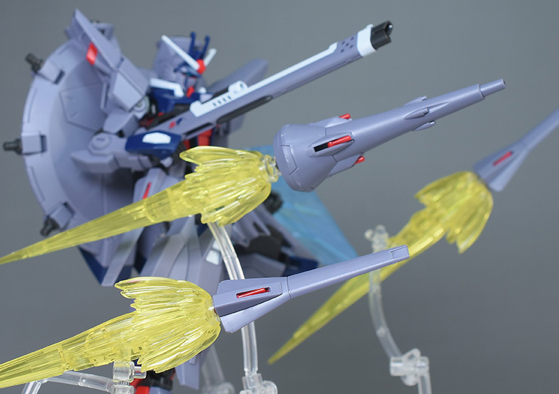バックパックが上方に展開できるので、劇中で見られた上部2基の大型ドラグーン「GDU-X7 突撃ビーム機動砲」を使った射撃ポーズも再現できます。キャノン風の攻撃でひと味違ったポージングが楽しめるようになっています。