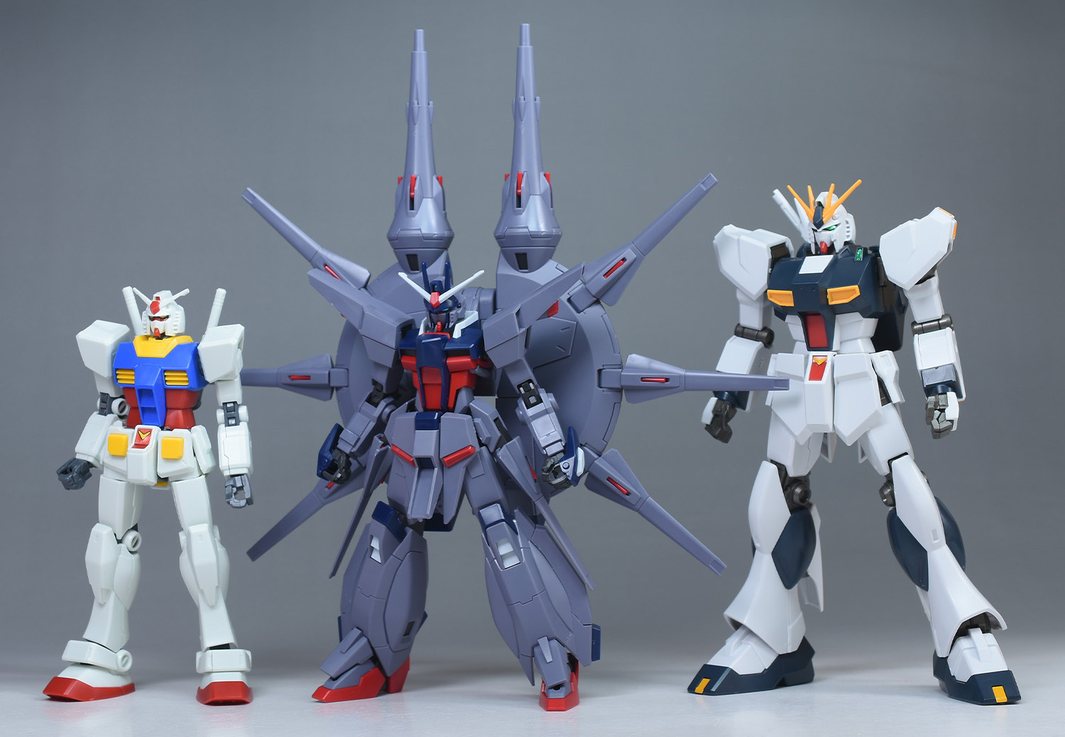HGUC RX-78-2ガンダム(リバイブ版)、HGUCνガンダム(ファンネルなし)と並べて大きさを確認。本体はRX-78-2と同程度に収まっていますが、背部バックパックによってMGほどの全高になっています。なのでディスプレイ時にはそれなりのスペースが必要。