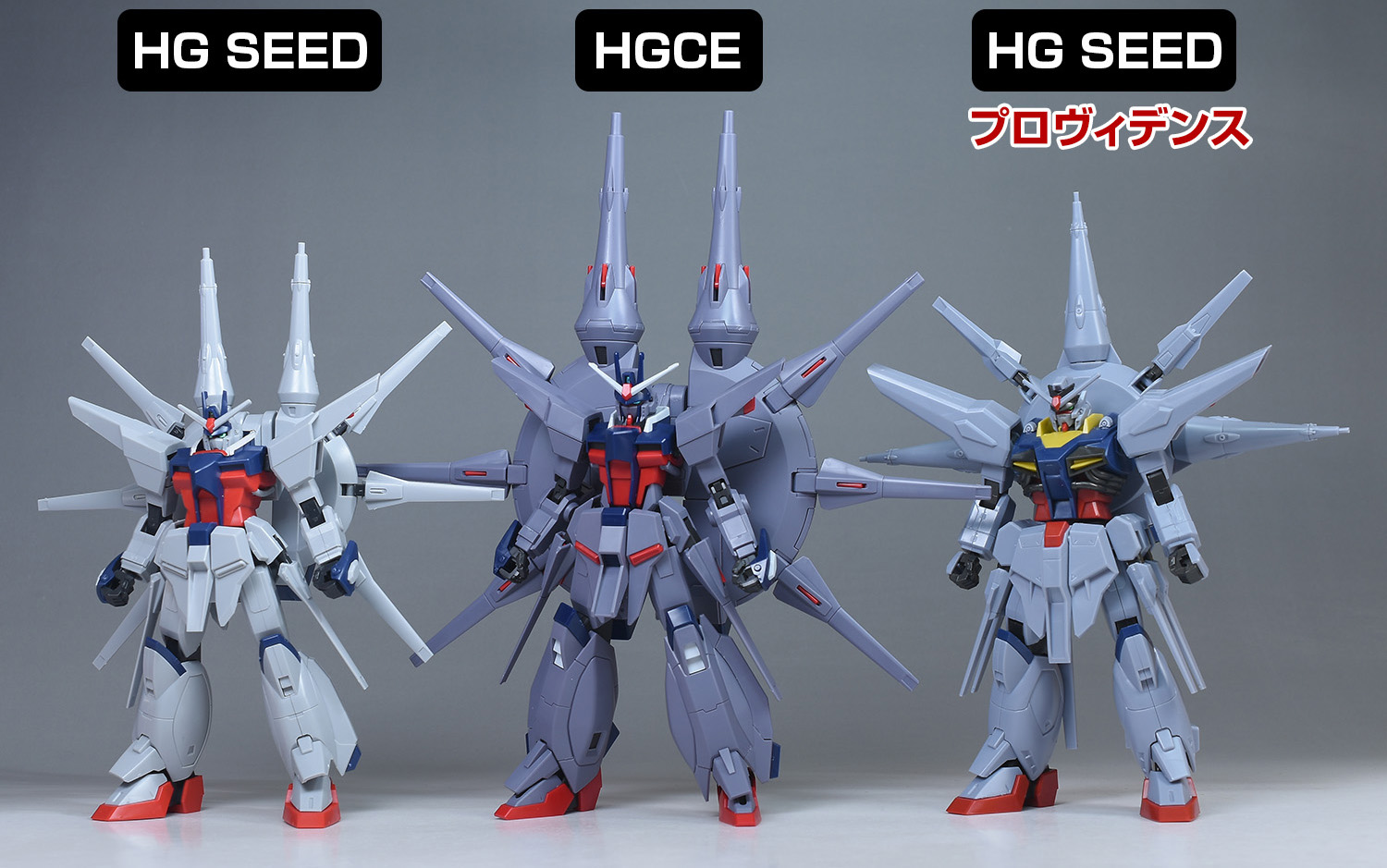 HG SEEDのレジェンドガンダム、プロヴィデンスガンダムと並べて比較。各種とも造りは良いですが、HGCEレジェンドは頭部や胸部が小さく、スタイリッシュでプロポーションが段違いに良いです。背部ドラグーンも大型化されて圧倒的な存在感を放っていますね。成形色もHGCEのほうがより渋みのあるカラーリングになっています。