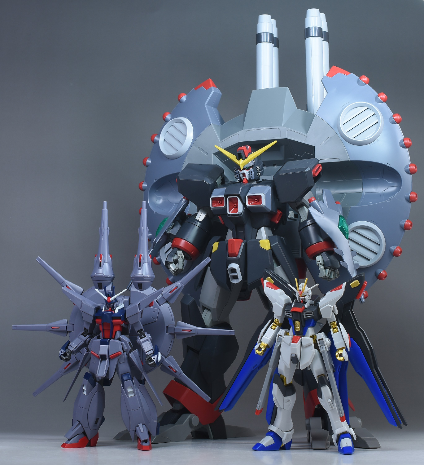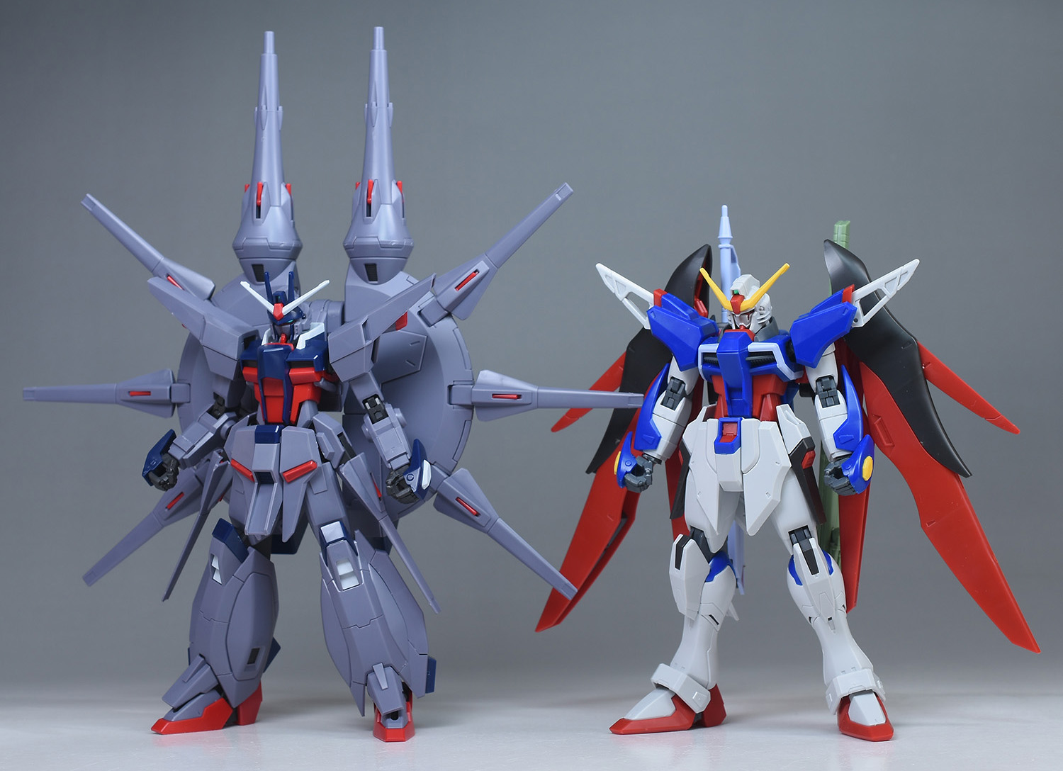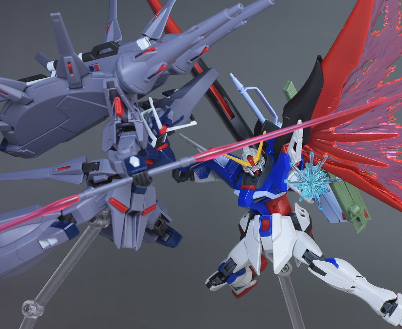 劇中で戦闘を繰り広げたHGCE デストロイガンダム、HGCEストフリ(光の翼版)とも並べて。デストロイガンダムとは設定通り、大きさにかなりの差があるので、組み合わせてディスプレイさせると劇中のリアルで臨場感ある戦闘シーンが演出できそうです。