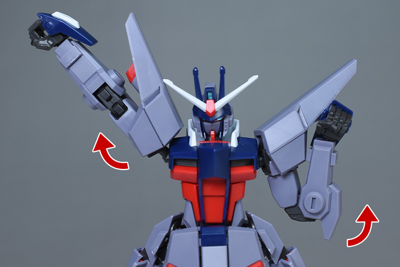 腕は肩部引き出しギミックやボールジョイント接続によって真上にまで展開することができます。ショルダーアーマーも個別に可動するので干渉しません。肘も2重関節で深くまで曲げられます。