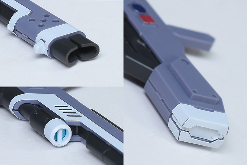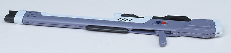 高エネルギービームライフルはグリップに凹凸がなく、ハンドパーツに差し込むだけで保持が可能。手甲をバラす手間がないので保持非保持がラクです。
