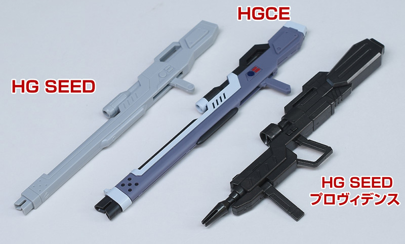 HG SEEDレジェンドとプロヴィデンスのビームライフルと並べて比較。プロヴィデンスはユーディキウムで別物。