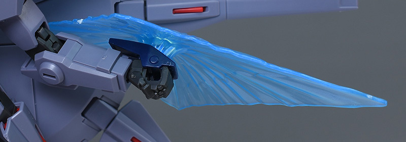 ビームシールドはクリアブルーの色鮮やかなエフェクトが付属。手甲の白いパーツを外して組み替えることで簡単に装備させることができます。エフェクトパーツは手甲から吹き出すように造形されていてリアル。