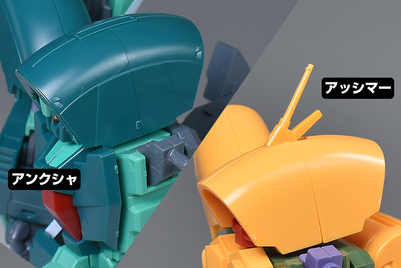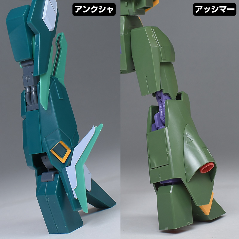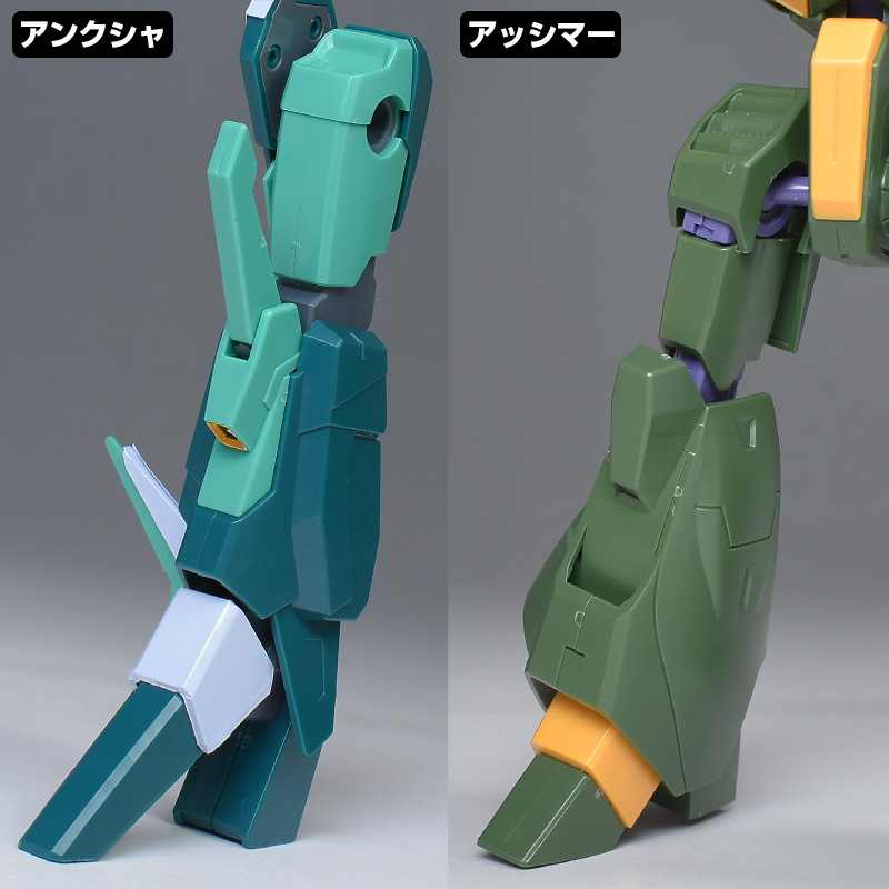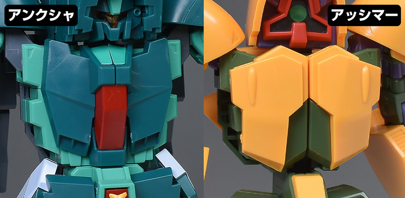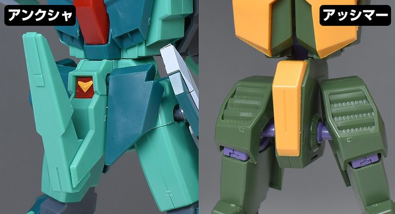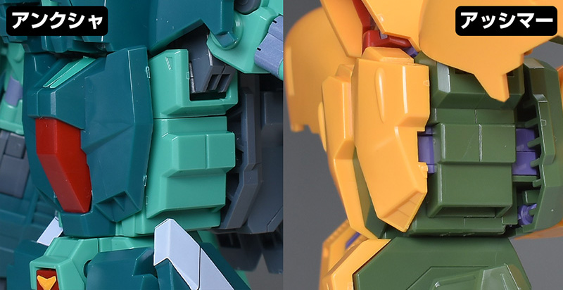 腰部をアッシマーと並べて比較。アッシマーがシンプルな縦長装甲なのに対し、アンクシャはフロントアーマーに幅のある装甲が造形。中央にはリゼルなどのメタス系に見られる尖った装甲が造形されています。腰部中央のV字は黄色いシールでの色分け。
