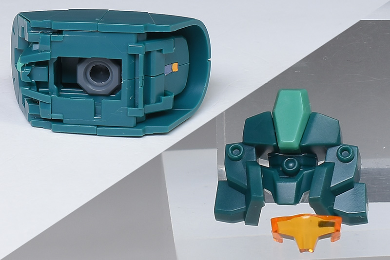 成形色はグリーンとライトグリーンを基調に、頭部バイザーにクリアオレンジ、胸部中央にレッドを配色。その他、内部や関節、バックパックなどがグレー成型色での再現となっています。